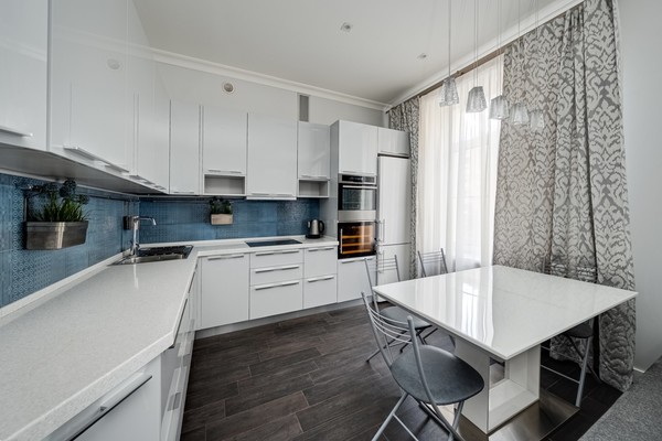 Планировка продумана до мелочей: итальянская лаковая кухня с каменной столешницей совмещена с гостиной, раздельные санузел и просторная ванная комната с фирменной сантехникой Villeroy & Boch, гигиеническим душем, водонагревателем, испанской плиткой, подогревом полов. Окна выходят во двор, поэтому в квартире всегда тихо и светло. Хорошая звуко- и теплоизоляция.