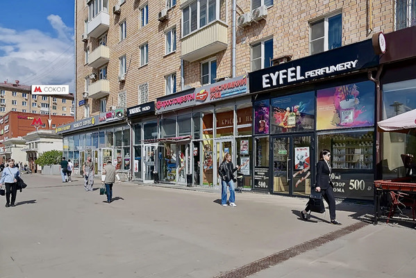 Помещение расположено на 1-й фасадной линии Ленинградского проспекта, в 30 метрах от м. Сокол, между 2 выходами из метро с трафиком 83 тыс. человек/сутки.Густонаселенный престижный район Сокол, с населением более 58 тыс. чел., отлично развитой инфраструктурой, транспортной доступностью и экологичностью. В окружении большое количество ВУЗов и Бизнес-центров.Рядом расположен торговый центр «Метромаркет», бизнес - квартал класса А «Alcon» и БЦ класса В+ «Сокол-центр».Совокупность этих факторов генерит сверхинтенсивные пешеходные и транспортные потоки, вдоль помещения.