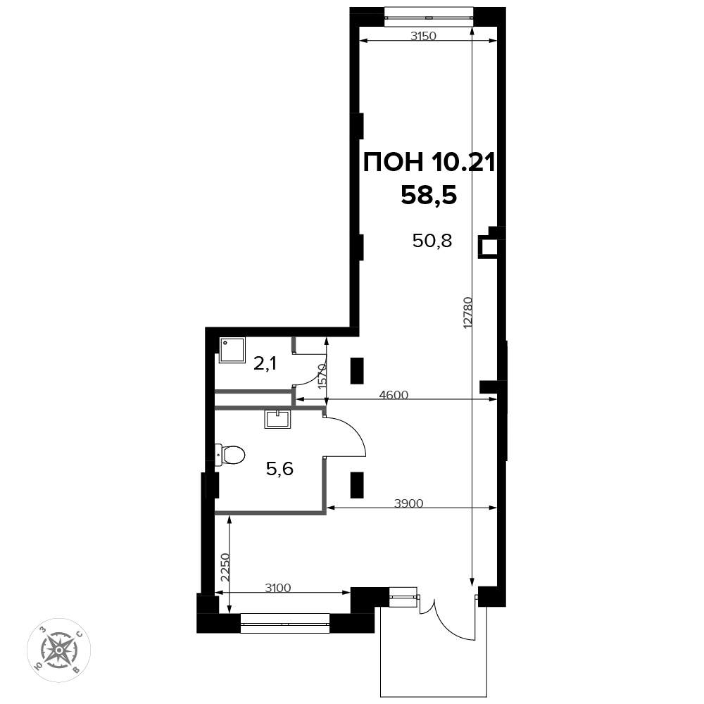 - Общая площадь 58.6 м²
