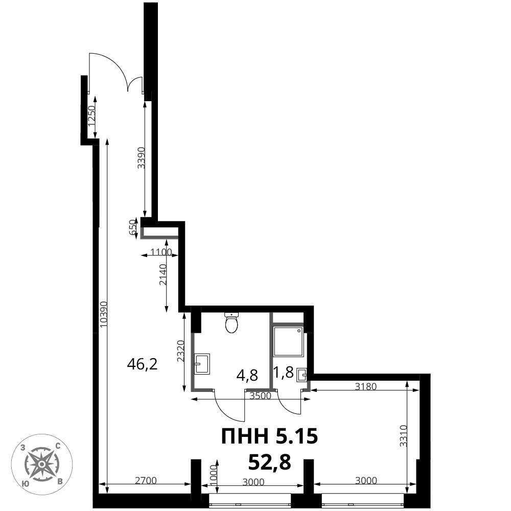 - Общая площадь 52.8 м²