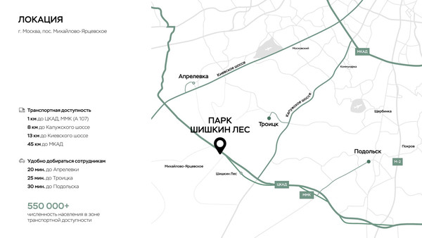 Расположение: г Москва, поселение Михайлово-Ярцевское, поселок Шишкин Лес, (Юго-Запад, - 33 км от МКАД - 2 км от ЦКАД). федеральные трассы Калужское шоссе, Киевское шоссе!