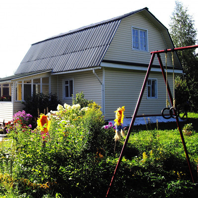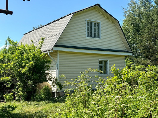 Садовый бревенчатый Дом 2006 года постройки общей площадью 114 кв.м., из них жилая площадь - 65 кв.м. На первом этаже - две комнаты + кухня/веранда + терраса, две комнаты на втором этаже, цокольный этаж. Газовая плита (газ в баллонах). Отопление печное, печь с плитой. Дом светлый и уютный.