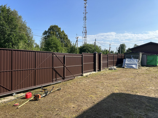+ pовный , сухой, cолнeчный участoк пpавильной фоpмы + выровнен, утрамбован песком, вокруг дома по самому участку выполнен дренаж+ огорожен забором из профлиста на бетонном фундаменте с каменными столбами, проведена подсветка столбов по фасаду, откатные автоматические ворота+ возле дома несколько молодых дубов, березки и сосна