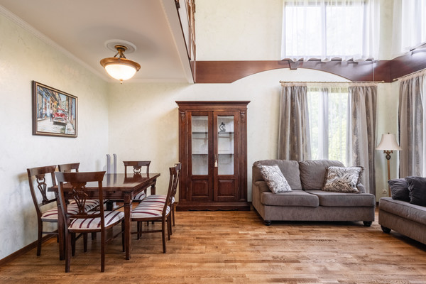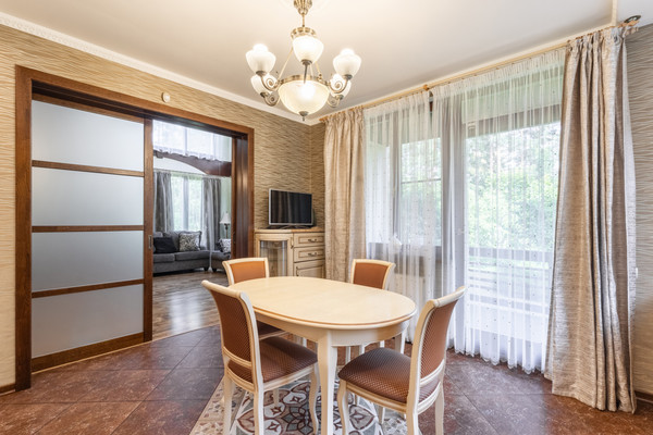 ПЛАНИРОВКА ДОМА:1-й этаж:- Просторная кухня-гостиная с выходом во двор на летнюю веранду и к летнему домику - беседке с камином и печью;-Просторная гостиная, позволяющая разместить большую семью или тёплый круг друзей;-Изолированная гостевая комната;-Сауна с комнатой отдыха и видовым теплым застекленным балконом;А также, на первом этаже Котельная, 2 сан.узла, гардеробная;