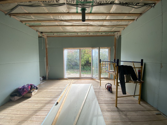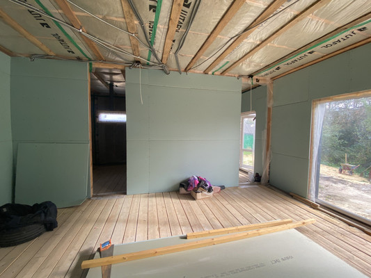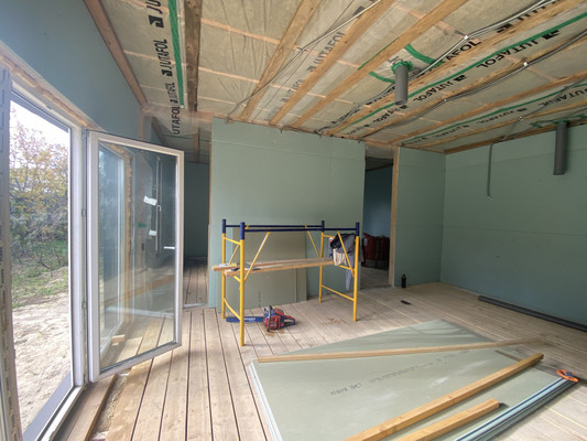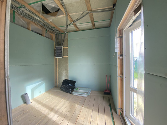Что готово: - Дом 12×6м, стены утеплены 200 мм - Свет 15 кВт, вода заведена • Окна в пол - Rehau, - Двойной влагостойкий гипсокартон- Участок с дренажом, септик, скважина - Котельная 4×2м