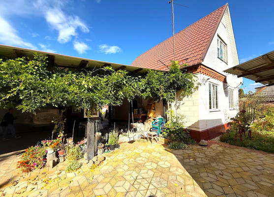 Во дворе тротуарная плитка, большой навес, гараж, хозяйственные постройки.