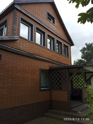 Дом из бруса, обшит сайдингом.Крыша - металлочерепица. Окна - пластиковые.