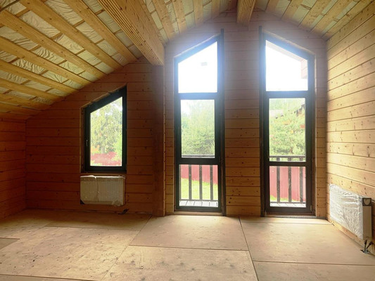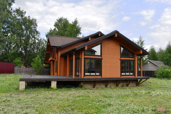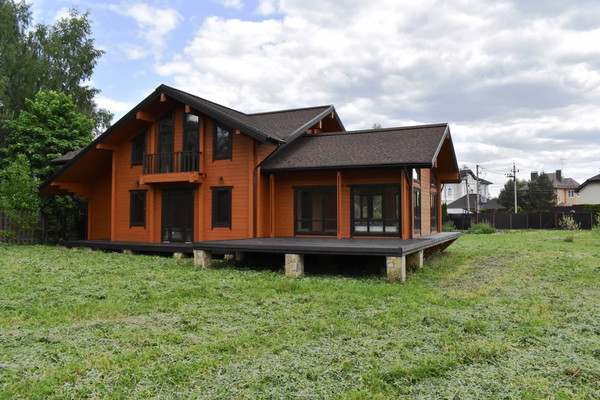Двухуровневый дом из клееного бруса 264,8 кв.м. в стиле швейцарского шале, построен по авторскому проекту на земельном участке в 23 сотки. Соседи все вокруг построились и живут постоянно.