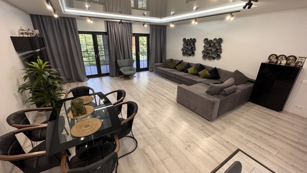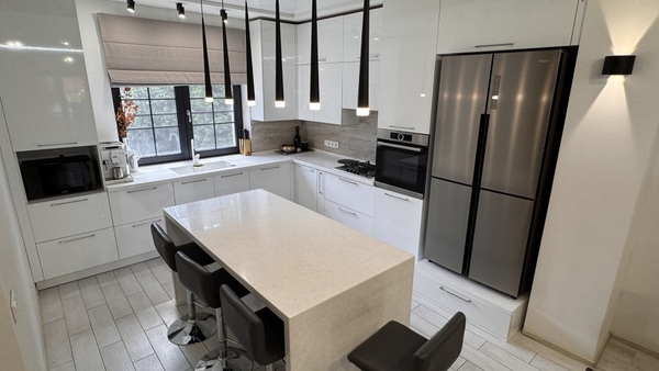 Инженерия выполнена полностью из немецких материалов. Все оборудование — из Германии. Электроэнергия 15 кВт, вся разводка из идентичных качественных материалов, в щитке разведена каждая розетка. Установлена система умный дом, дом сам регулирует температуру, что экономит на коммунальных счетах. Приточно-вытяжная система вентиляции. Вода — своя скважина, установлена дополнительная т<strong>рехступенчатая </strong> водоподготовка, прошла пробы. Канализация выполнена с расчётом на все мокрые точки, Топаз. Обслуживание Топаза 1 раз в год. Теплый водяной пол везде, где плитка. Установлен генератор с самозапуском. Система видеонаблюдения. Подстветка фасада дома и всего участка на атоматических датчиках.