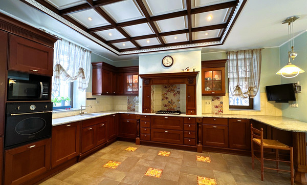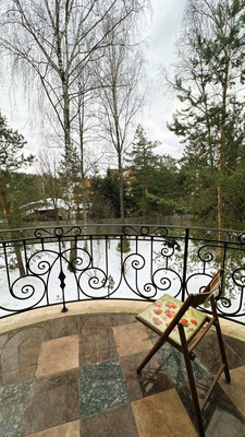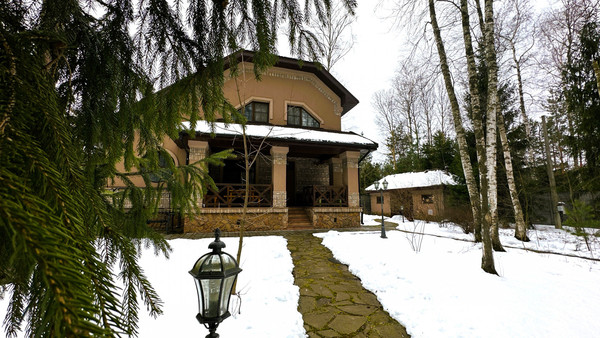 Об основном домеДом имеет два этажа и мансарду. На первом этаже расположены просторная гостиная и кабинет-мастерская с камином и большими окнами, которые обеспечивают естественное освещение и создают уютную атмосферу.Через холл первого этажа можно попасть в кухню-столовую. В холле также находятся гостевой санузел, гардеробная, котельная и дополнительный выход на улицу.Кухня оборудована газовой плитой, оформленной в виде очага, а столовая зона расположена в эркере, что придаёт ей особый шарм и простор. В кухне также есть дополнительное помещение для размещения морозильника и хранения продуктов.На первом этаже предусмотрено водяное отопление пола, а пол покрыт натуральным мрамором.На втором этаже находятся библиотека, кабинет, мастер-спальня с ванной комнатой и джакузи, гостевая спальня с санузлом и гардеробная. Все эти помещения объединены просторным холлом второго этажа.Мансардный этаж отведён под зону отдыха с бильярдным столом, барной стойкой и мягкой мебелью. Здесь также расположены спальня и ванная комната, а также хозяйственная зона с прачечной и кладовой.В интерьере дома на втором этаже использованы дубовые доски, износостойкие ковровые покрытия с разнообразными орнаментами, тиснёные обои, витражи в дверях, мраморные подоконники в тон обоев и штор каждой комнаты, качественные ткани и портьеры. Английские классические камины и элегантная дубовая лестница с ажурным кованым ограждением создают единый образ этого дома.По всему дому установлена система пр...