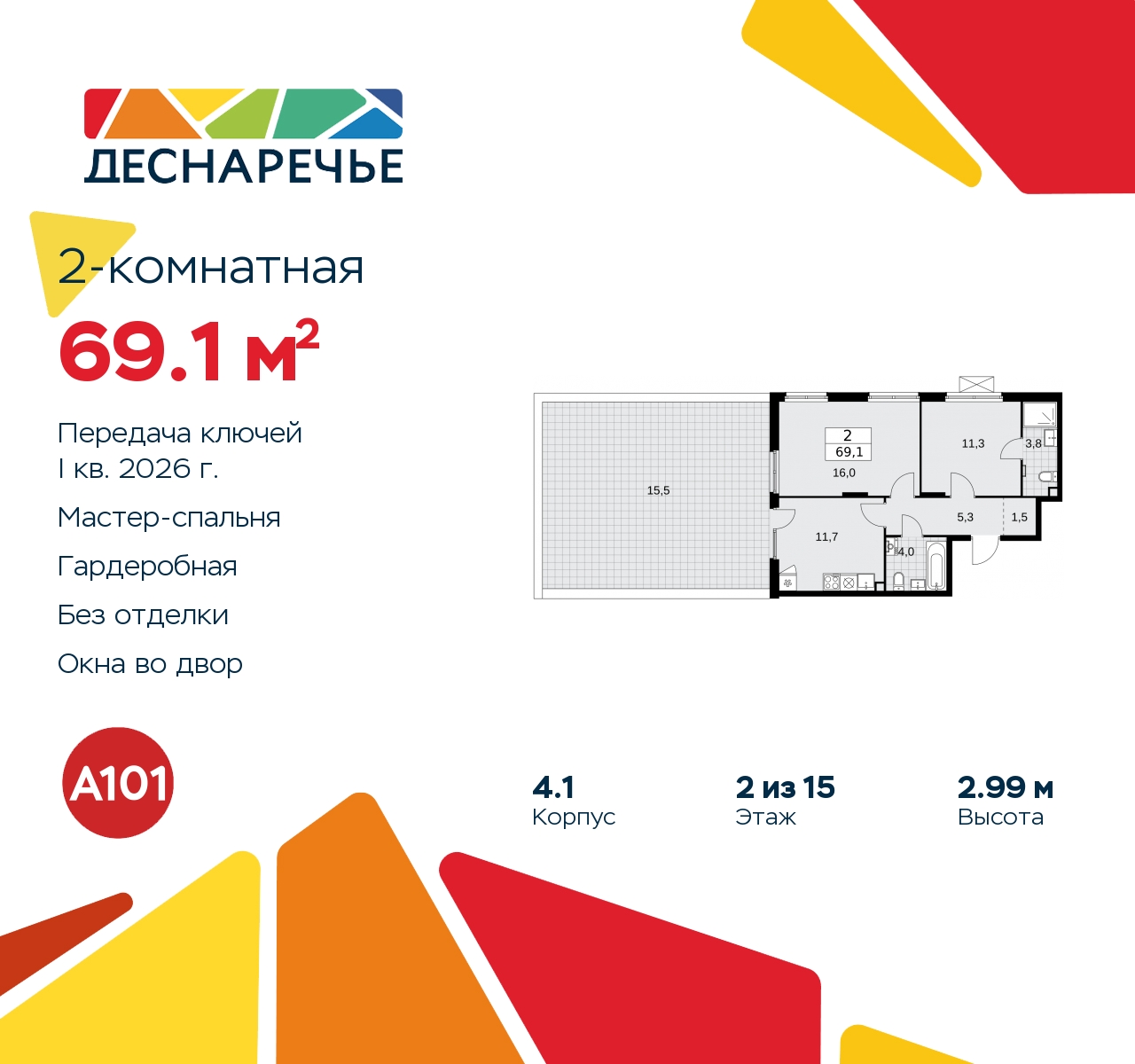 Продается 2-комн. квартира от застройщика в ЖК "Деснаречье" на 2 этаже. Квартира без отделки, полностью готова к ремонту. Общая площадь: 69.1 кв.м., жилая: 27.3 кв.м., площадь просторной кухни-столовой: 11.7 кв.м. Угловая квартира, идеально подойдет любителям тишины и панорамных видов. В квартире один балкон, два совмещенных санузла. Наличие в квартире террасы площадью 15.5 кв.м. дает возможность для обустройства дополнительной площади. Высота потолков 2.99 м. Эта квартира предлагается без отделки. Будут установлены стеклопакеты с повышенной тепло- и шумоизоляцией, в квартиру заведены все коммуникации. Вы сможете в полном объеме реализовать ваши идеи обустройства вашего комфортного дома. Для тех, кто ценит время и не хочет дополнительных трат на ремонт мы предлагаем квартиры с предчистовой и дизайнерской отделкой. Имеется ниша под гардероб. Дом монолитный, трехподъездный, высотой 15 этажей. Квартира находится в 1-й секции в корпусе 4.1. На этаже 6 квартир. В подъезде 1 пассажирский и 1 грузовой лифт. Начало строительства - 3 квартал 2023 года. Окончание строительства - 1 квартал 2026 года. Оформление сделки по договору долевого участия. Артикул квартиры по базе застройщика 88К-4.1-6. ПРЕДЛОЖЕНИЯ ОТ ЗАСТРОЙЩИКА В ОКТЯБРЕ 2025: Ипотека от 13,9 % для всех! На весь срок. "Семейная ипотека" вернулась. Ставка от 3,5 % на весь срок! Без удорожания! Выгодное ипотечное комбо: Ипотека от 2200 р./мес. и от 6 % после рождения ребёнка! Ипотека для всех "Держи пять!" - ставка 5 % на 2 года! *более подробную информацию по скидкам и акциям уточняйте в отделе продаж Масштабный проект "Деснаречье" на юго-западе Москвы, который включает три новых района («квартала»), объединённые общей идеей – воплотить в реальность мечты современных жителей столицы об интересном, комфортном и разноплановом городском пространстве в окружении рек и лесов, словно сошедших с полотен русских живописцев: - «Берег» оценят все, кому близка водная стихия: плеск волн, солнечные блики и прогулки вдоль тихого течения речи. - «Лес» утопает в зелени парков и лесов. Здесь соблюдён идеальный баланс загородного спокойствия и столичного комфорта. - «Парк», самый энергичный и яркий, отличается высокой концентрацией пространств для спорта и творчества. Жилой комплекс "Деснаречье" расположится в 12 км от МКАД по современному Калужскому шоссе. Внешний облик зданий соответствует современному стилю и стандартам, характерным и для других популярных проектов ГК «А101»: сочетание контрастных тонов, большое количество остекления, в котором отражается небо, гармония с природным окружением. Весь город - в вашем районе. Находиться на территории «15-минутного города» значит иметь всё необходимое для полноценной жизни в шаговой доступности. Маршруты в районе «Деснаречье» выстроены так, чтобы добраться до магазинов, парков, школ, салонов услуг и других объектов можно было всего за несколько минут пешком или на велосипеде. Двор закрытый от машин – это тишина, комфорт и безопасность, поэтому все машино-места (включая «семейные» и увеличенные, с возможностью установки роллетных шкафов) находятся в подземном паркинге. В паркинги можно спуститься на лифте из любого подъезда или по лестнице. Рядом с «Деснаречьем» в 2027 году планируется открытие станции метро «Десна», до которой будет удобно добраться пешком или на велосипеде. Дорога на автомобиле д