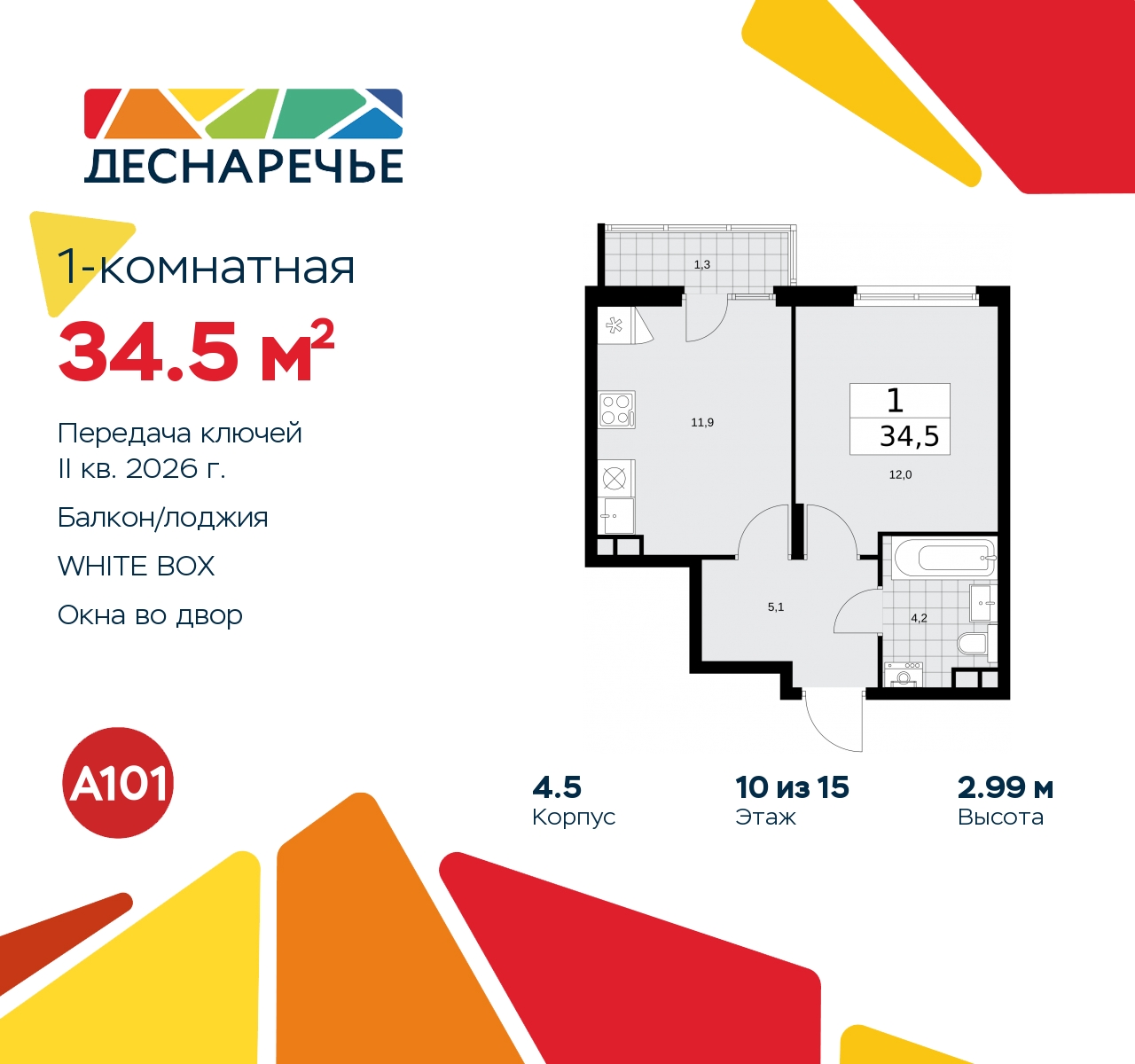 Просторная 1-комн. квартира с отделкой в ЖК "Деснаречье" на 10 этаже. Общая площадь: 34.5 кв.м., жилая: 12 кв.м., площадь просторной кухни-столовой: 12 кв.м. Все окна выходят на одну сторону. В квартире один балкон, один совмещенный санузел. Высота потолков 2.99 м. Эта квартира будет сдана с дизайнеркой отделкой "под ключ". Специально для вас мы разработали несколько решений дизайнерской отделки. В отделке используются только современный высококлассные материалы, на все работы предоставляется гарантия. В таком случае вы оплачиваете отделку в сегодняшних ценах, а эту стоимость вы можете разнести в ипотечных платежах. Дом монолитный, черырехподъездный, переменной этажности, от 12 до 15 этажей. Квартира находится в 3-й секции высотой 12 этажей в корпусе 4.5. На этаже 6 квартир. В подъезде 1 пассажирский и 1 грузовой лифт. Начало строительства - 3 квартал 2023 года. Окончание строительства - 2 квартал 2026 года. Оформление сделки по договору долевого участия. Артикул квартиры по базе застройщика 88К-4.5-1207. Масштабный проект "Деснаречье" на юго-западе Москвы, который включает три новых района («квартала»), объединённые общей идеей – воплотить в реальность мечты современных жителей столицы об интересном, комфортном и разноплановом городском пространстве в окружении рек и лесов, словно сошедших с полотен русских живописцев: - «Берег» оценят все, кому близка водная стихия: плеск волн, солнечные блики и прогулки вдоль тихого течения речи. - «Лес» утопает в зелени парков и лесов. Здесь соблюдён идеальный баланс загородного спокойствия и столичного комфорта. - «Парк», самый энергичный и яркий, отличается высокой концентрацией пространств для спорта и творчества. Жилой комплекс "Деснаречье" расположится в 12 км от МКАД по современному Калужскому шоссе. Внешний облик зданий соответствует современному стилю и стандартам, характерным и для других популярных проектов ГК «А101»: сочетание контрастных тонов, большое количество остекления, в котором отражается небо, гармония с природным окружением. Весь город - в вашем районе. Находиться на территории «15-минутного города» значит иметь всё необходимое для полноценной жизни в шаговой доступности. Маршруты в районе «Деснаречье» выстроены так, чтобы добраться до магазинов, парков, школ, салонов услуг и других объектов можно было всего за несколько минут пешком или на велосипеде. Двор закрытый от машин – это тишина, комфорт и безопасность, поэтому все машино-места (включая «семейные» и увеличенные, с возможностью установки роллетных шкафов) находятся в подземном паркинге. В паркинги можно спуститься на лифте из любого подъезда или по лестнице. Рядом с «Деснаречьем» в 2027 году планируется открытие станции метро «Десна», до которой будет удобно добраться пешком или на велосипеде. Дорога на автомобиле до перехватывающих парковок станций «Ольховая» и «Прокшино» займёт около 10 минут. В процессе реализации проекта будут появляться новые маршруты общественного транспорта по районам. Уже сейчас на Калужском шоссе развита сеть наземного транспорта: два десятка автобусов и маршрутных такси прибывают на остановки с интервалом 5–10 минут. (AQID02264494)