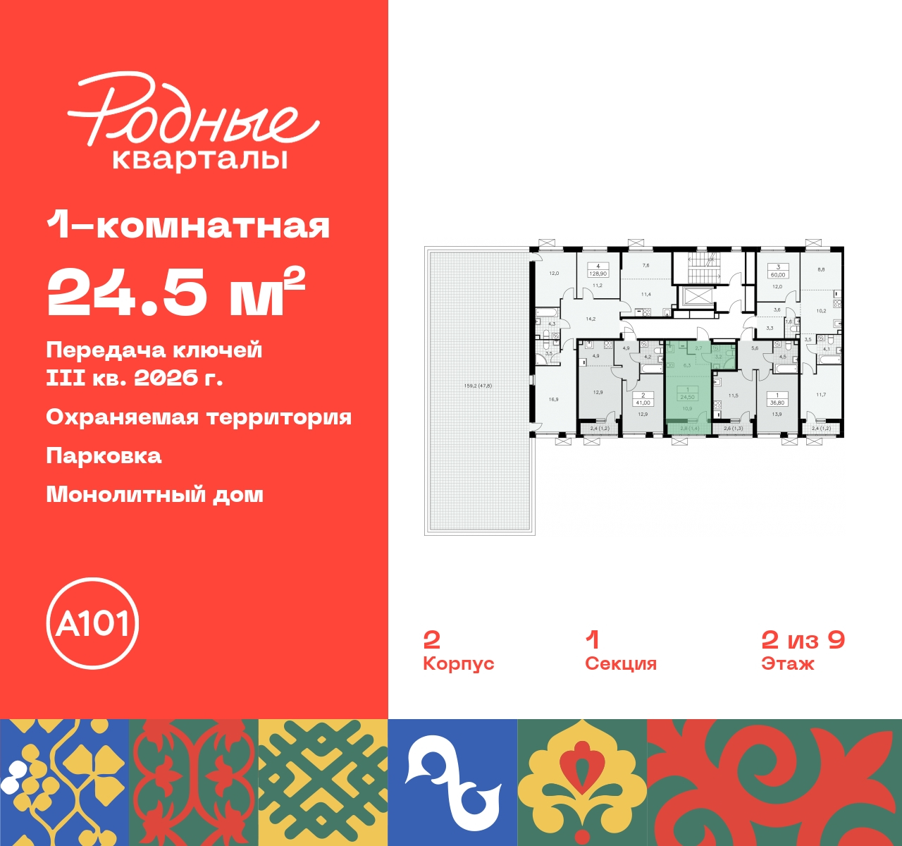 Просторная 1-комн. квартира-студия в ЖК "Родные кварталы" на 2 этаже. Квартира без отделки, после оформления собственности можно делать ремонт. Общая площадь: 24.5 кв.м., площадь гостиной 17.2 кв.м., из которых 6.3 кв.м. выделено под кухонную зону. Все окна выходят на одну сторону. В квартире один балкон, один совмещенный санузел. Высота потолков 2.9 м. Дом монолитный, многоподъездный, высотой 9 этажей. Квартира находится в 1-й секции в корпусе 2. На этаже 5 квартир. В подъезде 1 грузовой лифт. Начало строительства - 4 квартал 2023 года. Окончание строительства - 3 квартал 2026 года. Оформление сделки по договору долевого участия. Артикул квартиры по базе застройщика 96К-2-3. Новый жилой комплекс "Родные кварталы" строится в уютной, экологически благополучной локации на юго-западе столицы. В ближайшем окружении – ухоженные малоэтажные посёлки и живописный Ульяновский лесопарк. Благодаря этому из окон откроются вдохновляющие виды, которые не исчезнут со временем за фасадами многоэтажек. Через весь район пройдёт главный бульвар, который свяжет набережную, жилые кварталы и площади в единое дружелюбное пространство, органично наполненное узнаваемыми элементами культурных традиций разных народов. В жилом комплексе создаются условия для комфортного отдыха и занятий спортом всех жителей. Здесь можно прогуляться и отдохнуть в лесопарке на берегу ручья, позаниматься на тренажёрах под открытым небом и спортивных площадках. Для малышей построят игровые комплексы, развивающие силу, координацию и ловкость. Всего в жилом комплексе будет оборудовано 6 га территории для спокойного отдыха и около 9 га — для активного. Подъезды в домах освещены в любое время суток, входы и вестибюль хорошо просматриваются с улицы. Витражное остекление обеспечивает приток естественного света днём, а вечером зажигаются светильники. В отделке домов используется сочетание вентилируемого фасада с облицовкой из фибробетонной плитки и штукатуркой. Комфортная высота домов соразмерна человеку и в среднем составляет 10 этажей. Все дома обеспечены собственными подземными паркингами. В них размещаются машино-места и кладовые. В паркинг или кладовую можно спуститься на лифте или по лестнице. В комплексе появятся бытовые сервисы, магазины, аптеки и другие торгово-бытовые объекты. В жилом районе «Родные кварталы» будут построены: - образовательный центр: школа на 1300 учеников и детский сад на 250 малышей, - два детских сада на 200 мест каждый (один из них сдаётся в 1-й очереди). В транспортной доступности уже работают: - школа № 41 и детский сад — по Боровскому шоссе, - школа № 2057 и детский сад — на запад от района, в дер. Марушкино. ЖК «Родные кварталы» строится в Новомосковском округе столицы, в 15 минутах на автомобиле от аэропорта «Внуково». Район обеспечен удобными выездами на три крупные современные автотрассы. Здесь уже работает и активно развивается система наземного общественного транспорта, включая междугородние рейсы. Интенсивное развитие локации обеспечивают две действующие станции крупных транспортных линий: метро (станция «Внуково») и МЦД (станция «Толстопальцево»). (AQID02295322)