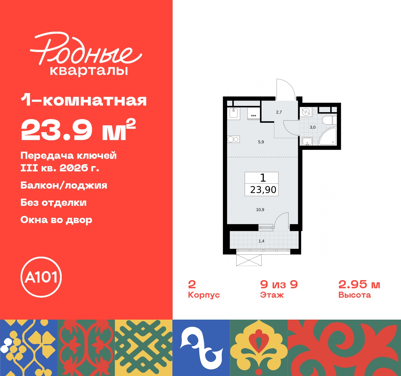 1-комн. квартира-студия от застройщика в ЖК "Родные кварталы" на 9 этаже. Квартира без отделки, после выдачи ключей можно делать ремонт. Общая площадь: 23.9 кв.м., площадь гостиной 16.8 кв.м., из которых 5.9 кв.м. выделено под кухонную зону. Все окна выходят на одну сторону. В квартире один балкон, один совмещенный санузел. Высота потолков 2.9 м. Дом монолитный, многоподъездный, высотой 9 этажей. Квартира находится в 1-й секции в корпусе 2. На этаже 5 квартир. В подъезде 1 грузовой лифт. Начало строительства - 4 квартал 2023 года. Окончание строительства - 3 квартал 2026 года. Оформление сделки по договору долевого участия. Артикул квартиры по базе застройщика 96К-2-38. Новый жилой комплекс "Родные кварталы" строится в уютной, экологически благополучной локации на юго-западе столицы. В ближайшем окружении – ухоженные малоэтажные посёлки и живописный Ульяновский лесопарк. Благодаря этому из окон откроются вдохновляющие виды, которые не исчезнут со временем за фасадами многоэтажек. Через весь район пройдёт главный бульвар, который свяжет набережную, жилые кварталы и площади в единое дружелюбное пространство, органично наполненное узнаваемыми элементами культурных традиций разных народов. В жилом комплексе создаются условия для комфортного отдыха и занятий спортом всех жителей. Здесь можно прогуляться и отдохнуть в лесопарке на берегу ручья, позаниматься на тренажёрах под открытым небом и спортивных площадках. Для малышей построят игровые комплексы, развивающие силу, координацию и ловкость. Всего в жилом комплексе будет оборудовано 6 га территории для спокойного отдыха и около 9 га — для активного. Подъезды в домах освещены в любое время суток, входы и вестибюль хорошо просматриваются с улицы. Витражное остекление обеспечивает приток естественного света днём, а вечером зажигаются светильники. В отделке домов используется сочетание вентилируемого фасада с облицовкой из фибробетонной плитки и штукатуркой. Комфортная высота домов соразмерна человеку и в среднем составляет 10 этажей. Все дома обеспечены собственными подземными паркингами. В них размещаются машино-места и кладовые. В паркинг или кладовую можно спуститься на лифте или по лестнице. В комплексе появятся бытовые сервисы, магазины, аптеки и другие торгово-бытовые объекты. В жилом районе «Родные кварталы» будут построены: - образовательный центр: школа на 1300 учеников и детский сад на 250 малышей, - два детских сада на 200 мест каждый (один из них сдаётся в 1-й очереди). В транспортной доступности уже работают: - школа № 41 и детский сад — по Боровскому шоссе, - школа № 2057 и детский сад — на запад от района, в дер. Марушкино. ЖК «Родные кварталы» строится в Новомосковском округе столицы, в 15 минутах на автомобиле от аэропорта «Внуково». Район обеспечен удобными выездами на три крупные современные автотрассы. Здесь уже работает и активно развивается система наземного общественного транспорта, включая междугородние рейсы. Интенсивное развитие локации обеспечивают две действующие станции крупных транспортных линий: метро (станция «Внуково») и МЦД (станция «Толстопальцево»). (AQID02295356)