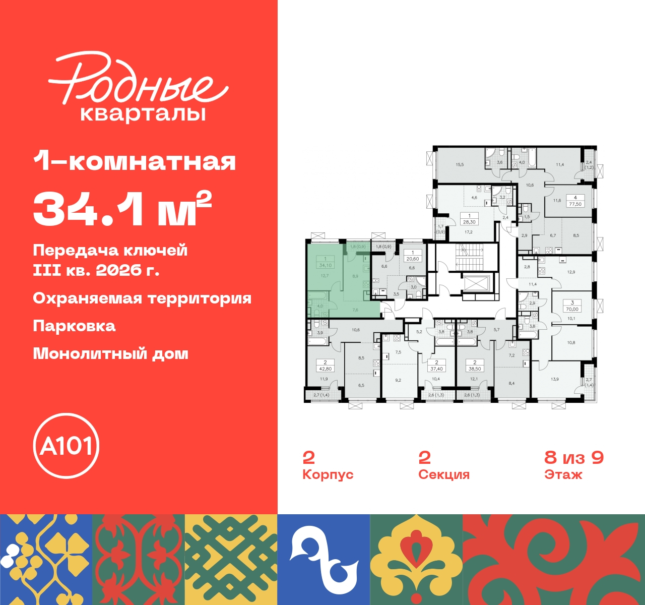 - Общая площадь 34.1 м²