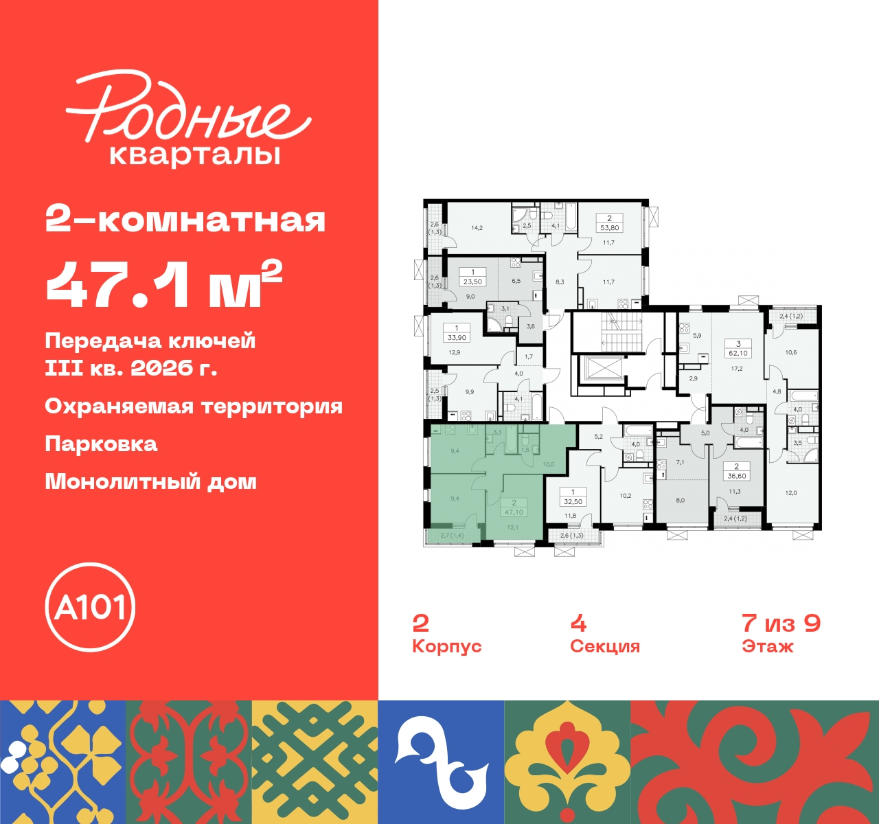 Продается двухкомнатная квартира в ЖК "Родные кварталы" на 7 этаже. Квартира без отделки, новый владелец может сделать ремонт по индивидуальному дизайн-проекту. Общая площадь: 47.1 кв.м., жилая: 21.5 кв.м., площадь просторной кухни-столовой: 9.4 кв.м. Квартира угловая, окна oбecпeчивaют paвнoмepнoe ocвeщeниe в тeчeниe дня. В квартире одна лоджия, один раздельный санузел. Высота потолков 2.9 м. Дом монолитный, многоподъездный, высотой 9 этажей. Квартира находится в 4-й секции в корпусе 2. На этаже 7 квартир. В подъезде 1 грузовой лифт. Начало строительства - 4 квартал 2023 года. Окончание строительства - 3 квартал 2026 года. Оформление сделки по договору долевого участия. Артикул квартиры по базе застройщика 96К-2-183. ПРЕДЛОЖЕНИЯ ОТ ЗАСТРОЙЩИКА В ОКТЯБРЕ 2025: Ипотека от 13,9 % для всех! На весь срок. "Семейная ипотека" вернулась. Ставка от 3,5 % на весь срок! Без удорожания! Выгодное ипотечное комбо: Ипотека от 2200 р./мес. и от 6 % после рождения ребёнка! Ипотека для всех "Держи пять!" - ставка 5 % на 2 года! *более подробную информацию по скидкам и акциям уточняйте в отделе продаж Новый жилой комплекс "Родные кварталы" строится в уютной, экологически благополучной локации на юго-западе столицы. В ближайшем окружении – ухоженные малоэтажные посёлки и живописный Ульяновский лесопарк. Благодаря этому из окон откроются вдохновляющие виды, которые не исчезнут со временем за фасадами многоэтажек. Через весь район пройдёт главный бульвар, который свяжет набережную, жилые кварталы и площади в единое дружелюбное пространство, органично наполненное узнаваемыми элементами культурных традиций разных народов. В жилом комплексе создаются условия для комфортного отдыха и занятий спортом всех жителей. Здесь можно прогуляться и отдохнуть в лесопарке на берегу ручья, позаниматься на тренажёрах под открытым небом и спортивных площадках. Для малышей построят игровые комплексы, развивающие силу, координацию и ловкость. Всего в жилом комплексе будет оборудовано 6 га территории для спокойного отдыха и около 9 га — для активного. Подъезды в домах освещены в любое время суток, входы и вестибюль хорошо просматриваются с улицы. Витражное остекление обеспечивает приток естественного света днём, а вечером зажигаются светильники. В отделке домов используется сочетание вентилируемого фасада с облицовкой из фибробетонной плитки и штукатуркой. Комфортная высота домов соразмерна человеку и в среднем составляет 10 этажей. Все дома обеспечены собственными подземными паркингами. В них размещаются машино-места и кладовые. В паркинг или кладовую можно спуститься на лифте или по лестнице. В комплексе появятся бытовые сервисы, магазины, аптеки и другие торгово-бытовые объекты. В жилом районе «Родные кварталы» будут построены: - образовательный центр: школа на 1300 учеников и детский сад на 250 малышей, - два детских сада на 200 мест каждый (один из них сдаётся в 1-й очереди). В транспортной доступности уже работают: - школа № 41 и детский сад — по Боровскому шоссе, - школа № 2057 и детский сад — на запад от района, в дер. Марушкино. ЖК «Родные кварталы» строится в Новомосковском округе столицы, в 15 минутах на автомобиле от аэропорта «Внуково». Район обеспечен удобными выездами на три крупные современные автотрассы. Здесь уже работает и активно развивается система наземного общественного транспорта, включая междугородн