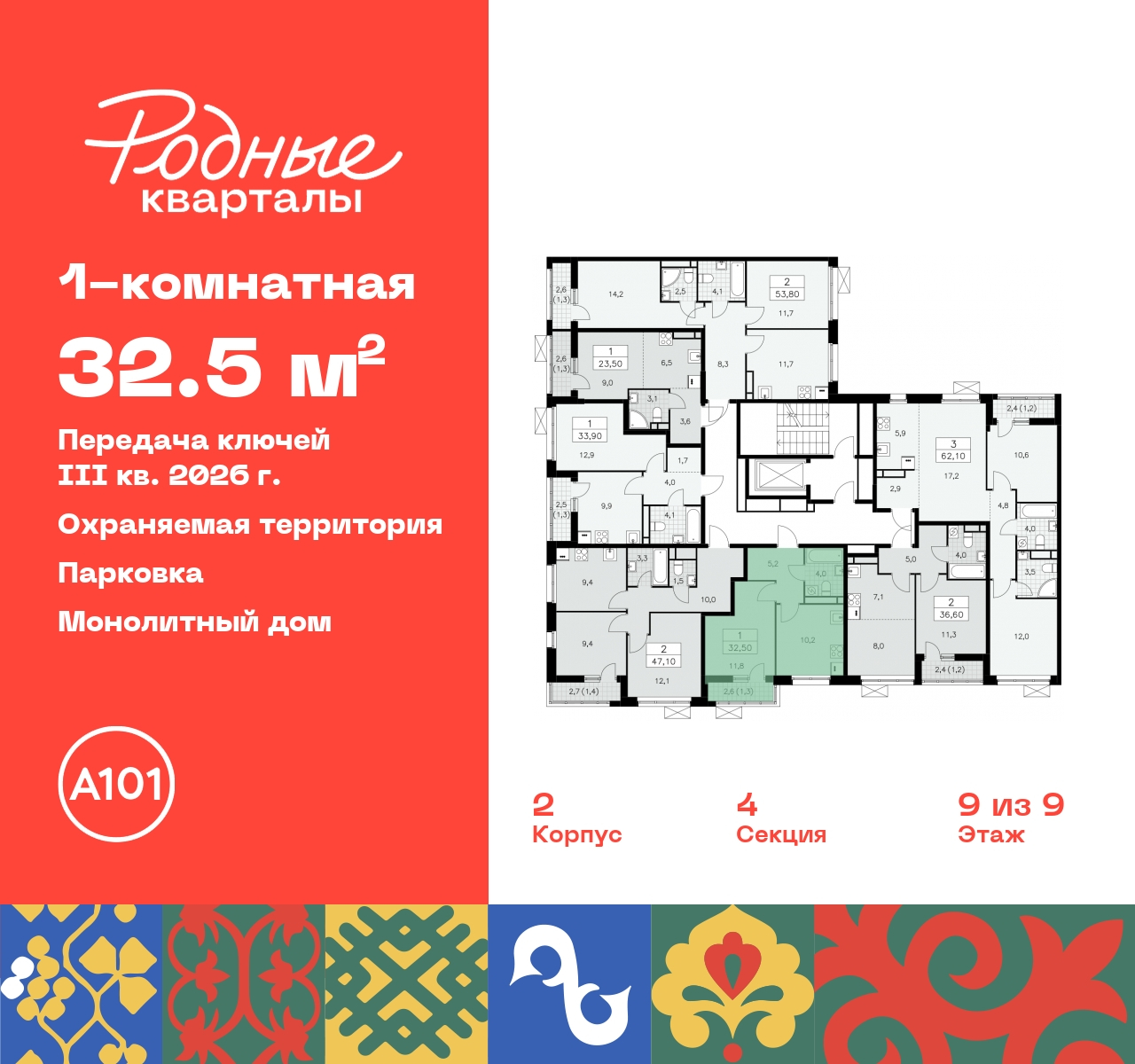 Однокомнатная квартира от застройщика в ЖК "Родные кварталы" на 9 этаже. Квартира без отделки, после получения ключей можно делать ремонт. Общая площадь: 32.5 кв.м., жилая: 11.8 кв.м., площадь просторной кухни-столовой: 10.2 кв.м. Все окна выходят на одну сторону. В квартире один балкон, один совмещенный санузел. Высота потолков 2.9 м. Имеется ниша под гардероб. Дом монолитный, многоподъездный, высотой 9 этажей. Квартира находится в 4-й секции в корпусе 2. На этаже 7 квартир. В подъезде 1 грузовой лифт. Начало строительства - 4 квартал 2023 года. Окончание строительства - 3 квартал 2026 года. Оформление сделки по договору долевого участия. Артикул квартиры по базе застройщика 96К-2-196. ПРЕДЛОЖЕНИЯ ОТ ЗАСТРОЙЩИКА В ОКТЯБРЕ 2025: Ипотека от 13,9 % для всех! На весь срок. "Семейная ипотека" вернулась. Ставка от 3,5 % на весь срок! Без удорожания! Выгодное ипотечное комбо: Ипотека от 2200 р./мес. и от 6 % после рождения ребёнка! Ипотека для всех "Держи пять!" - ставка 5 % на 2 года! *более подробную информацию по скидкам и акциям уточняйте в отделе продаж Новый жилой комплекс "Родные кварталы" строится в уютной, экологически благополучной локации на юго-западе столицы. В ближайшем окружении – ухоженные малоэтажные посёлки и живописный Ульяновский лесопарк. Благодаря этому из окон откроются вдохновляющие виды, которые не исчезнут со временем за фасадами многоэтажек. Через весь район пройдёт главный бульвар, который свяжет набережную, жилые кварталы и площади в единое дружелюбное пространство, органично наполненное узнаваемыми элементами культурных традиций разных народов. В жилом комплексе создаются условия для комфортного отдыха и занятий спортом всех жителей. Здесь можно прогуляться и отдохнуть в лесопарке на берегу ручья, позаниматься на тренажёрах под открытым небом и спортивных площадках. Для малышей построят игровые комплексы, развивающие силу, координацию и ловкость. Всего в жилом комплексе будет оборудовано 6 га территории для спокойного отдыха и около 9 га — для активного. Подъезды в домах освещены в любое время суток, входы и вестибюль хорошо просматриваются с улицы. Витражное остекление обеспечивает приток естественного света днём, а вечером зажигаются светильники. В отделке домов используется сочетание вентилируемого фасада с облицовкой из фибробетонной плитки и штукатуркой. Комфортная высота домов соразмерна человеку и в среднем составляет 10 этажей. Все дома обеспечены собственными подземными паркингами. В них размещаются машино-места и кладовые. В паркинг или кладовую можно спуститься на лифте или по лестнице. В комплексе появятся бытовые сервисы, магазины, аптеки и другие торгово-бытовые объекты. В жилом районе «Родные кварталы» будут построены: - образовательный центр: школа на 1300 учеников и детский сад на 250 малышей, - два детских сада на 200 мест каждый (один из них сдаётся в 1-й очереди). В транспортной доступности уже работают: - школа № 41 и детский сад — по Боровскому шоссе, - школа № 2057 и детский сад — на запад от района, в дер. Марушкино. ЖК «Родные кварталы» строится в Новомосковском округе столицы, в 15 минутах на автомобиле от аэропорта «Внуково». Район обеспечен удобными выездами на три крупные современные автотрассы. Здесь уже работает и активно развивается система наземного общественного транспорта, включая междугородние рейсы. Интенсивное ра