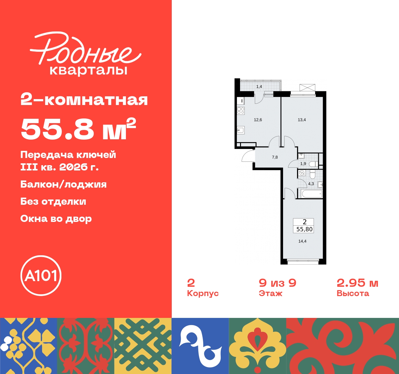 • Общая площадь 55.8 м²