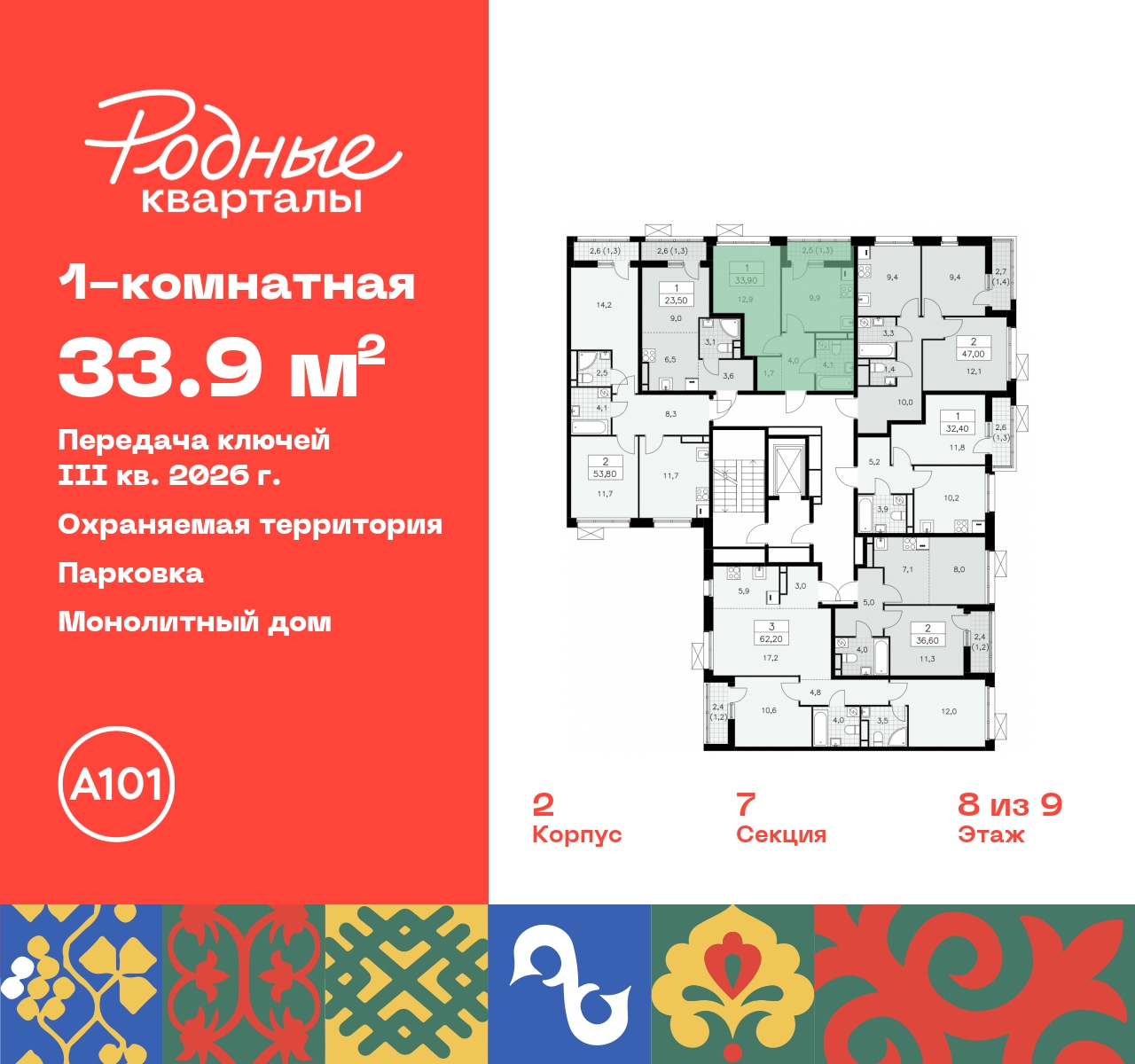 1-комн. квартира от застройщика в ЖК "Родные кварталы" на 8 этаже. Квартира без отделки, новый собственник может сделать ремонт по своему проекту. Общая площадь: 33.9 кв.м., жилая: 12.9 кв.м., площадь просторной кухни-столовой: 9.9 кв.м. Все окна выходят на одну сторону. В квартире одна лоджия, один совмещенный санузел. Высота потолков 2.9 м. Имеется ниша под гардероб. Дом монолитный, многоподъездный, высотой 9 этажей. Квартира находится в 7-й секции в корпусе 2. На этаже 7 квартир. В подъезде 1 грузовой лифт. Начало строительства - 4 квартал 2023 года. Окончание строительства - 3 квартал 2026 года. Оформление сделки по договору долевого участия. Артикул квартиры по базе застройщика 96К-2-325. Новый жилой комплекс "Родные кварталы" строится в уютной, экологически благополучной локации на юго-западе столицы. В ближайшем окружении – ухоженные малоэтажные посёлки и живописный Ульяновский лесопарк. Благодаря этому из окон откроются вдохновляющие виды, которые не исчезнут со временем за фасадами многоэтажек. Через весь район пройдёт главный бульвар, который свяжет набережную, жилые кварталы и площади в единое дружелюбное пространство, органично наполненное узнаваемыми элементами культурных традиций разных народов. В жилом комплексе создаются условия для комфортного отдыха и занятий спортом всех жителей. Здесь можно прогуляться и отдохнуть в лесопарке на берегу ручья, позаниматься на тренажёрах под открытым небом и спортивных площадках. Для малышей построят игровые комплексы, развивающие силу, координацию и ловкость. Всего в жилом комплексе будет оборудовано 6 га территории для спокойного отдыха и около 9 га — для активного. Подъезды в домах освещены в любое время суток, входы и вестибюль хорошо просматриваются с улицы. Витражное остекление обеспечивает приток естественного света днём, а вечером зажигаются светильники. В отделке домов используется сочетание вентилируемого фасада с облицовкой из фибробетонной плитки и штукатуркой. Комфортная высота домов соразмерна человеку и в среднем составляет 10 этажей. Все дома обеспечены собственными подземными паркингами. В них размещаются машино-места и кладовые. В паркинг или кладовую можно спуститься на лифте или по лестнице. В комплексе появятся бытовые сервисы, магазины, аптеки и другие торгово-бытовые объекты. В жилом районе «Родные кварталы» будут построены: - образовательный центр: школа на 1300 учеников и детский сад на 250 малышей, - два детских сада на 200 мест каждый (один из них сдаётся в 1-й очереди). В транспортной доступности уже работают: - школа № 41 и детский сад — по Боровскому шоссе, - школа № 2057 и детский сад — на запад от района, в дер. Марушкино. ЖК «Родные кварталы» строится в Новомосковском округе столицы, в 15 минутах на автомобиле от аэропорта «Внуково». Район обеспечен удобными выездами на три крупные современные автотрассы. Здесь уже работает и активно развивается система наземного общественного транспорта, включая междугородние рейсы. Интенсивное развитие локации обеспечивают две действующие станции крупных транспортных линий: метро (станция «Внуково») и МЦД (станция «Толстопальцево»). (AQID02295643)