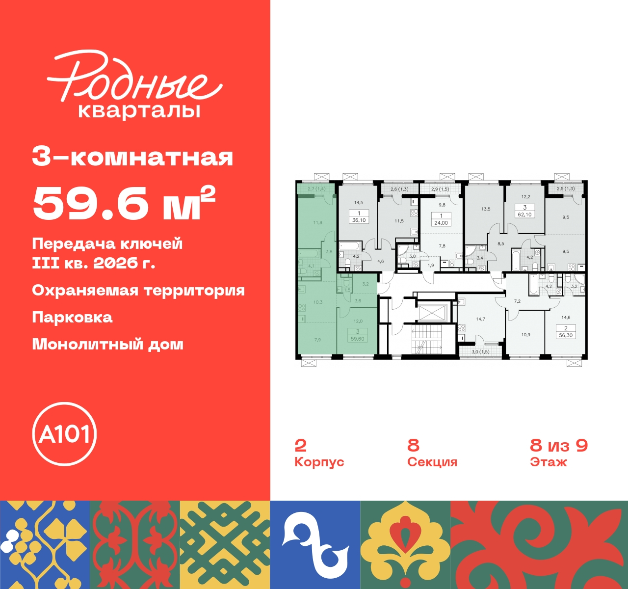 Трехкомнатная квартира с европланировкой в ЖК "Родные кварталы" на 8 этаже. Квартира без отделки, полностью готова к чистовой отделке и дальнейшему ремонту. Общая площадь: 59.6 кв.м., жилая: 31.7 кв.м., суммарная площадь гостиной-столовой с кухонной зоной: 18.2 кв.м. Европейская планировка, кухня и гостиная объединены в одно просторное помещение. Квартира - распашонка, без проходных комнат, окна выходят на paзные стороны дома. В квартире один балкон, один совмещенный и один раздельный санузел. Высота потолков 2.9 м. Дом монолитный, многоподъездный, высотой 9 этажей. Квартира находится в 8-й секции в корпусе 2. На этаже 5 квартир. В подъезде 1 грузовой лифт. Начало строительства - 4 квартал 2023 года. Окончание строительства - 3 квартал 2026 года. Оформление сделки по договору долевого участия. Артикул квартиры по базе застройщика 96К-2-367. Новый жилой комплекс "Родные кварталы" строится в уютной, экологически благополучной локации на юго-западе столицы. В ближайшем окружении – ухоженные малоэтажные посёлки и живописный Ульяновский лесопарк. Благодаря этому из окон откроются вдохновляющие виды, которые не исчезнут со временем за фасадами многоэтажек. Через весь район пройдёт главный бульвар, который свяжет набережную, жилые кварталы и площади в единое дружелюбное пространство, органично наполненное узнаваемыми элементами культурных традиций разных народов. В жилом комплексе создаются условия для комфортного отдыха и занятий спортом всех жителей. Здесь можно прогуляться и отдохнуть в лесопарке на берегу ручья, позаниматься на тренажёрах под открытым небом и спортивных площадках. Для малышей построят игровые комплексы, развивающие силу, координацию и ловкость. Всего в жилом комплексе будет оборудовано 6 га территории для спокойного отдыха и около 9 га — для активного. Подъезды в домах освещены в любое время суток, входы и вестибюль хорошо просматриваются с улицы. Витражное остекление обеспечивает приток естественного света днём, а вечером зажигаются светильники. В отделке домов используется сочетание вентилируемого фасада с облицовкой из фибробетонной плитки и штукатуркой. Комфортная высота домов соразмерна человеку и в среднем составляет 10 этажей. Все дома обеспечены собственными подземными паркингами. В них размещаются машино-места и кладовые. В паркинг или кладовую можно спуститься на лифте или по лестнице. В комплексе появятся бытовые сервисы, магазины, аптеки и другие торгово-бытовые объекты. В жилом районе «Родные кварталы» будут построены: - образовательный центр: школа на 1300 учеников и детский сад на 250 малышей, - два детских сада на 200 мест каждый (один из них сдаётся в 1-й очереди). В транспортной доступности уже работают: - школа № 41 и детский сад — по Боровскому шоссе, - школа № 2057 и детский сад — на запад от района, в дер. Марушкино. ЖК «Родные кварталы» строится в Новомосковском округе столицы, в 15 минутах на автомобиле от аэропорта «Внуково». Район обеспечен удобными выездами на три крупные современные автотрассы. Здесь уже работает и активно развивается система наземного общественного транспорта, включая междугородние рейсы. Интенсивное развитие локации обеспечивают две действующие станции крупных транспортных линий: метро (станция «Внуково») и МЦД (станция «Толстопальцево»). (AQID02295685)