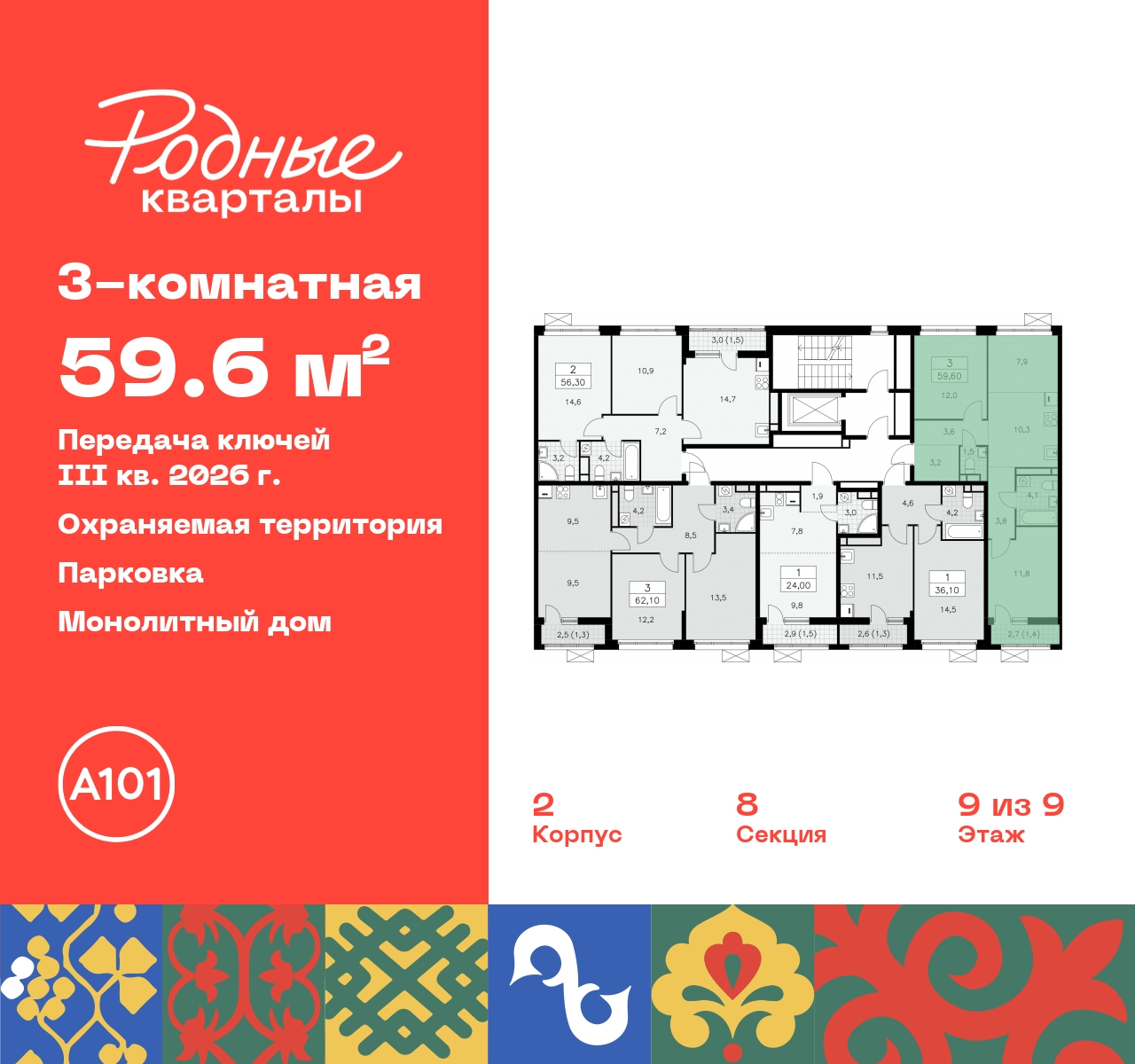 Продается трехкомнатная квартира с европланировкой от застройщика в ЖК "Родные кварталы" на 9 этаже. Квартира без отделки, полностью готова к чистовой отделке и дальнейшему ремонту. Общая площадь: 59.6 кв.м., жилая: 31.7 кв.м., суммарная площадь гостиной-столовой с кухонной зоной: 18.2 кв.м. Европланировка, площадь комнат позволяет разместить в них все необходимое, а в просторной кухне-гостиной удобно как готовить, так и отдыхать. Квартира - распашонка, без проходных комнат, окна выходят на paзные стороны дома. В квартире один балкон, один совмещенный и один раздельный санузел. Высота потолков 2.9 м. Дом монолитный, многоподъездный, высотой 9 этажей. Квартира находится в 8-й секции в корпусе 2. На этаже 5 квартир. В подъезде 1 грузовой лифт. Начало строительства - 4 квартал 2023 года. Окончание строительства - 3 квартал 2026 года. Оформление сделки по договору долевого участия. Артикул квартиры по базе застройщика 96К-2-372. ПРЕДЛОЖЕНИЯ ОТ ЗАСТРОЙЩИКА В ОКТЯБРЕ 2025: Ипотека от 13,9 % для всех! На весь срок. "Семейная ипотека" вернулась. Ставка от 3,5 % на весь срок! Без удорожания! Выгодное ипотечное комбо: Ипотека от 2200 р./мес. и от 6 % после рождения ребёнка! Ипотека для всех "Держи пять!" - ставка 5 % на 2 года! *более подробную информацию по скидкам и акциям уточняйте в отделе продаж Новый жилой комплекс "Родные кварталы" строится в уютной, экологически благополучной локации на юго-западе столицы. В ближайшем окружении – ухоженные малоэтажные посёлки и живописный Ульяновский лесопарк. Благодаря этому из окон откроются вдохновляющие виды, которые не исчезнут со временем за фасадами многоэтажек. Через весь район пройдёт главный бульвар, который свяжет набережную, жилые кварталы и площади в единое дружелюбное пространство, органично наполненное узнаваемыми элементами культурных традиций разных народов. В жилом комплексе создаются условия для комфортного отдыха и занятий спортом всех жителей. Здесь можно прогуляться и отдохнуть в лесопарке на берегу ручья, позаниматься на тренажёрах под открытым небом и спортивных площадках. Для малышей построят игровые комплексы, развивающие силу, координацию и ловкость. Всего в жилом комплексе будет оборудовано 6 га территории для спокойного отдыха и около 9 га — для активного. Подъезды в домах освещены в любое время суток, входы и вестибюль хорошо просматриваются с улицы. Витражное остекление обеспечивает приток естественного света днём, а вечером зажигаются светильники. В отделке домов используется сочетание вентилируемого фасада с облицовкой из фибробетонной плитки и штукатуркой. Комфортная высота домов соразмерна человеку и в среднем составляет 10 этажей. Все дома обеспечены собственными подземными паркингами. В них размещаются машино-места и кладовые. В паркинг или кладовую можно спуститься на лифте или по лестнице. В комплексе появятся бытовые сервисы, магазины, аптеки и другие торгово-бытовые объекты. В жилом районе «Родные кварталы» будут построены: - образовательный центр: школа на 1300 учеников и детский сад на 250 малышей, - два детских сада на 200 мест каждый (один из них сдаётся в 1-й очереди). В транспортной доступности уже работают: - школа № 41 и детский сад — по Боровскому шоссе, - школа № 2057 и детский сад — на запад от района, в дер. Марушкино. ЖК «Родные кварталы» строится в Новомосковском округе столицы, в 15 минутах 