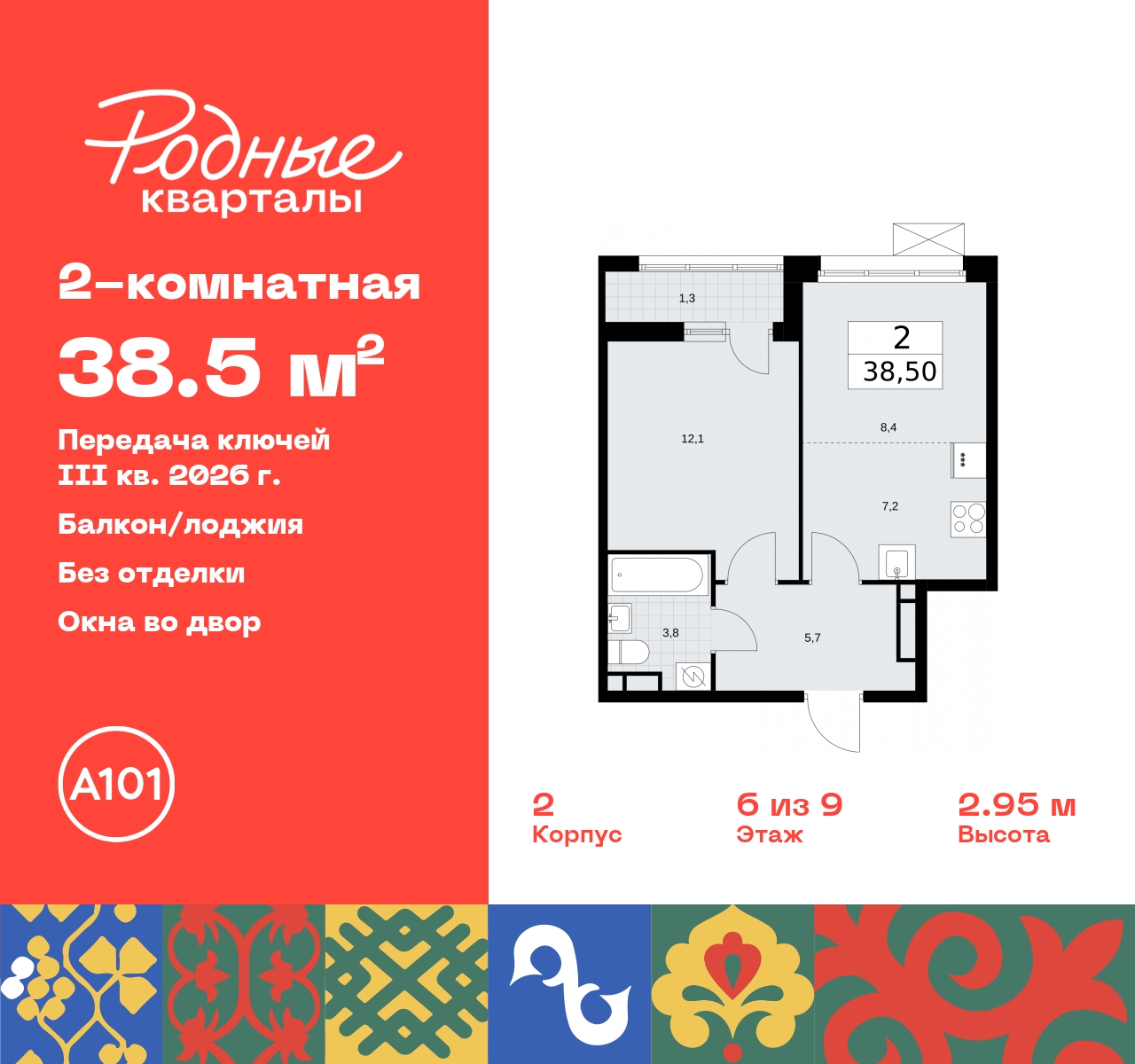 2-комн. квартира с европланировкой в ЖК "Родные кварталы" на 6 этаже. Квартира без отделки, новый собственник может сделать ремонт по индивидуальному дизайн-проекту. Общая площадь: 38.5 кв.м., жилая: 20.5 кв.м., суммарная площадь гостиной-столовой с кухонной зоной: 15.6 кв.м. Европланировка, в просторной кухне-гостиной удобно как готовить, так и отдыхать. Комнаты изолированные, все окна выходят на одну сторону. В квартире одна лоджия, один совмещенный санузел. Высота потолков 2.9 м. Дом монолитный, многоподъездный, высотой 9 этажей. Квартира находится в 9-й секции в корпусе 2. На этаже 8 квартир. В подъезде 1 грузовой лифт. Начало строительства - 4 квартал 2023 года. Окончание строительства - 3 квартал 2026 года. Оформление сделки по договору долевого участия. Артикул квартиры по базе застройщика 96К-2-413. ПРЕДЛОЖЕНИЯ ОТ ЗАСТРОЙЩИКА В ОКТЯБРЕ 2025: Ипотека от 13,9 % для всех! На весь срок. "Семейная ипотека" вернулась. Ставка от 3,5 % на весь срок! Без удорожания! Выгодное ипотечное комбо: Ипотека от 2200 р./мес. и от 6 % после рождения ребёнка! Ипотека для всех "Держи пять!" - ставка 5 % на 2 года! *более подробную информацию по скидкам и акциям уточняйте в отделе продаж Новый жилой комплекс "Родные кварталы" строится в уютной, экологически благополучной локации на юго-западе столицы. В ближайшем окружении – ухоженные малоэтажные посёлки и живописный Ульяновский лесопарк. Благодаря этому из окон откроются вдохновляющие виды, которые не исчезнут со временем за фасадами многоэтажек. Через весь район пройдёт главный бульвар, который свяжет набережную, жилые кварталы и площади в единое дружелюбное пространство, органично наполненное узнаваемыми элементами культурных традиций разных народов. В жилом комплексе создаются условия для комфортного отдыха и занятий спортом всех жителей. Здесь можно прогуляться и отдохнуть в лесопарке на берегу ручья, позаниматься на тренажёрах под открытым небом и спортивных площадках. Для малышей построят игровые комплексы, развивающие силу, координацию и ловкость. Всего в жилом комплексе будет оборудовано 6 га территории для спокойного отдыха и около 9 га — для активного. Подъезды в домах освещены в любое время суток, входы и вестибюль хорошо просматриваются с улицы. Витражное остекление обеспечивает приток естественного света днём, а вечером зажигаются светильники. В отделке домов используется сочетание вентилируемого фасада с облицовкой из фибробетонной плитки и штукатуркой. Комфортная высота домов соразмерна человеку и в среднем составляет 10 этажей. Все дома обеспечены собственными подземными паркингами. В них размещаются машино-места и кладовые. В паркинг или кладовую можно спуститься на лифте или по лестнице. В комплексе появятся бытовые сервисы, магазины, аптеки и другие торгово-бытовые объекты. В жилом районе «Родные кварталы» будут построены: - образовательный центр: школа на 1300 учеников и детский сад на 250 малышей, - два детских сада на 200 мест каждый (один из них сдаётся в 1-й очереди). В транспортной доступности уже работают: - школа № 41 и детский сад — по Боровскому шоссе, - школа № 2057 и детский сад — на запад от района, в дер. Марушкино. ЖК «Родные кварталы» строится в Новомосковском округе столицы, в 15 минутах на автомобиле от аэропорта «Внуково». Район обеспечен удобными выездами на три крупные современные автотрассы. Здесь уж