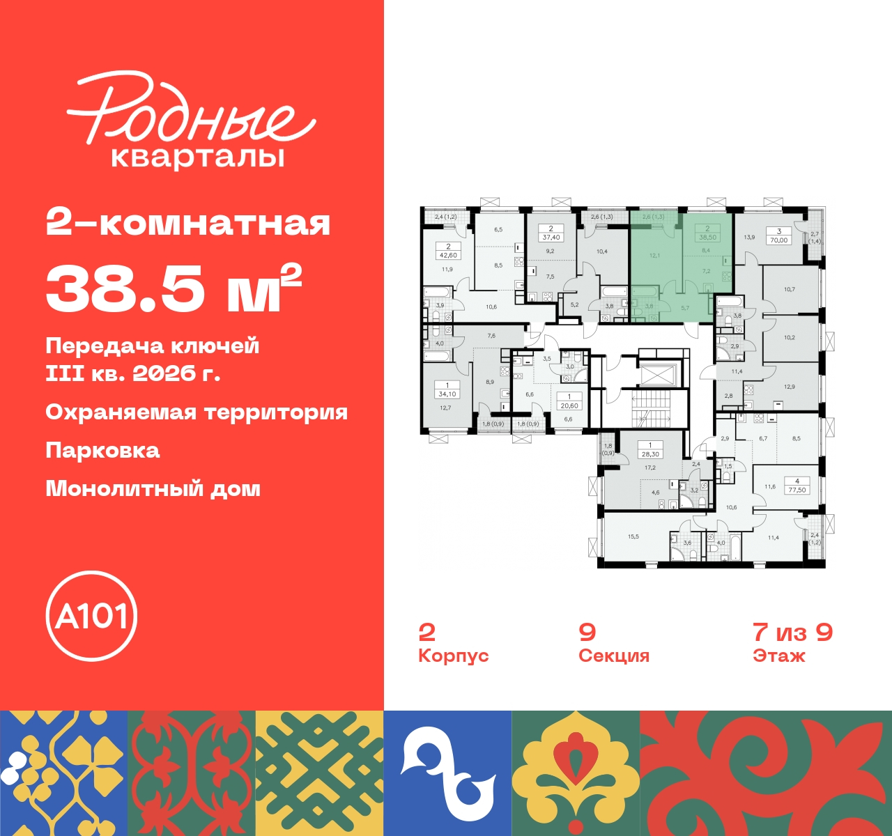 2-комн. квартира с европланировкой от застройщика в ЖК "Родные кварталы" на 7 этаже. Квартира без отделки, новый собственник может сделать ремонт по своему проекту. Общая площадь: 38.5 кв.м., жилая: 20.5 кв.м., общая площадь гостиной-столовой с кухонной зоной: 15.6 кв.м. Европейская планировка, в просторной кухне-гостиной удобно как готовить, так и отдыхать. Комнаты изолированные, все окна выходят на одну сторону. В квартире одна лоджия, один совмещенный санузел. Высота потолков 2.9 м. Дом монолитный, многоподъездный, высотой 9 этажей. Квартира находится в 9-й секции в корпусе 2. На этаже 8 квартир. В подъезде 1 грузовой лифт. Начало строительства - 4 квартал 2023 года. Окончание строительства - 3 квартал 2026 года. Оформление сделки по договору долевого участия. Артикул квартиры по базе застройщика 96К-2-421. ПРЕДЛОЖЕНИЯ ОТ ЗАСТРОЙЩИКА В ОКТЯБРЕ 2025: Ипотека от 13,9 % для всех! На весь срок. "Семейная ипотека" вернулась. Ставка от 3,5 % на весь срок! Без удорожания! Выгодное ипотечное комбо: Ипотека от 2200 р./мес. и от 6 % после рождения ребёнка! Ипотека для всех "Держи пять!" - ставка 5 % на 2 года! *более подробную информацию по скидкам и акциям уточняйте в отделе продаж Новый жилой комплекс "Родные кварталы" строится в уютной, экологически благополучной локации на юго-западе столицы. В ближайшем окружении – ухоженные малоэтажные посёлки и живописный Ульяновский лесопарк. Благодаря этому из окон откроются вдохновляющие виды, которые не исчезнут со временем за фасадами многоэтажек. Через весь район пройдёт главный бульвар, который свяжет набережную, жилые кварталы и площади в единое дружелюбное пространство, органично наполненное узнаваемыми элементами культурных традиций разных народов. В жилом комплексе создаются условия для комфортного отдыха и занятий спортом всех жителей. Здесь можно прогуляться и отдохнуть в лесопарке на берегу ручья, позаниматься на тренажёрах под открытым небом и спортивных площадках. Для малышей построят игровые комплексы, развивающие силу, координацию и ловкость. Всего в жилом комплексе будет оборудовано 6 га территории для спокойного отдыха и около 9 га — для активного. Подъезды в домах освещены в любое время суток, входы и вестибюль хорошо просматриваются с улицы. Витражное остекление обеспечивает приток естественного света днём, а вечером зажигаются светильники. В отделке домов используется сочетание вентилируемого фасада с облицовкой из фибробетонной плитки и штукатуркой. Комфортная высота домов соразмерна человеку и в среднем составляет 10 этажей. Все дома обеспечены собственными подземными паркингами. В них размещаются машино-места и кладовые. В паркинг или кладовую можно спуститься на лифте или по лестнице. В комплексе появятся бытовые сервисы, магазины, аптеки и другие торгово-бытовые объекты. В жилом районе «Родные кварталы» будут построены: - образовательный центр: школа на 1300 учеников и детский сад на 250 малышей, - два детских сада на 200 мест каждый (один из них сдаётся в 1-й очереди). В транспортной доступности уже работают: - школа № 41 и детский сад — по Боровскому шоссе, - школа № 2057 и детский сад — на запад от района, в дер. Марушкино. ЖК «Родные кварталы» строится в Новомосковском округе столицы, в 15 минутах на автомобиле от аэропорта «Внуково». Район обеспечен удобными выездами на три крупные современные автотрассы. Здесь 