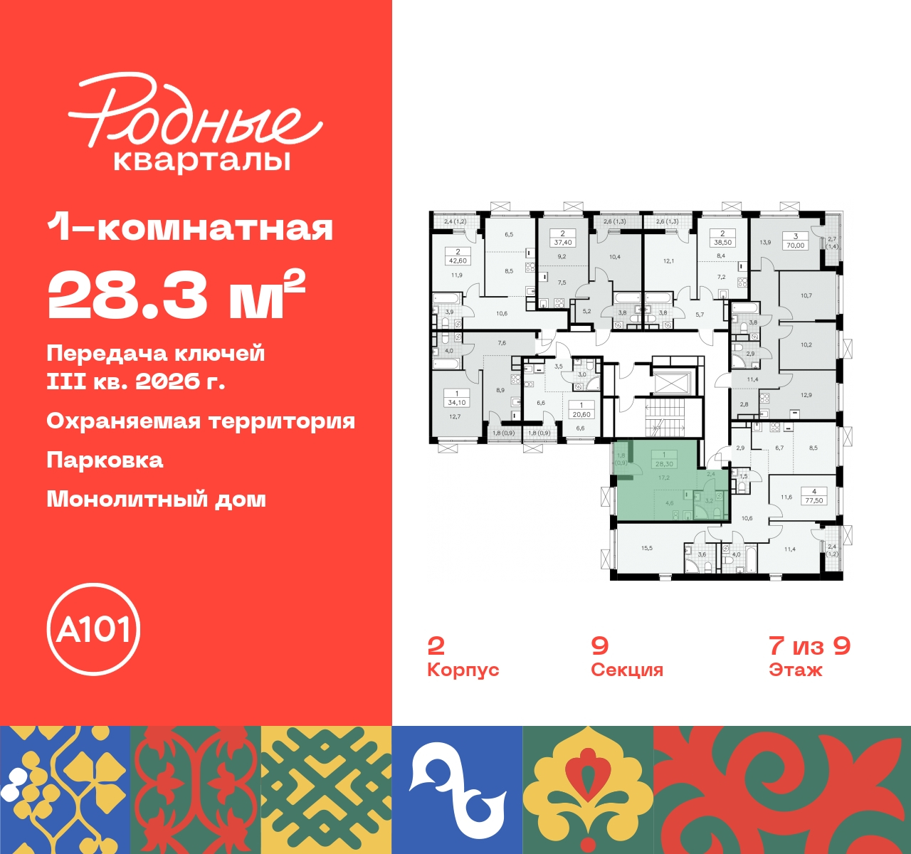 Просторная однокомнатная квартира-студия в ЖК "Родные кварталы" на 7 этаже. Квартира без отделки, новый владелец может сделать ремонт по своему дизайн-проекту. Общая площадь: 28.3 кв.м., площадь гостиной 21.8 кв.м., из которых 4.6 кв.м. выделено под кухонную зону. Все окна выходят на одну сторону. В квартире одна лоджия, один совмещенный санузел. Высота потолков 2.9 м. Дом монолитный, многоподъездный, высотой 9 этажей. Квартира находится в 9-й секции в корпусе 2. На этаже 8 квартир. В подъезде 1 грузовой лифт. Начало строительства - 4 квартал 2023 года. Окончание строительства - 3 квартал 2026 года. Оформление сделки по договору долевого участия. Артикул квартиры по базе застройщика 96К-2-424. Новый жилой комплекс "Родные кварталы" строится в уютной, экологически благополучной локации на юго-западе столицы. В ближайшем окружении – ухоженные малоэтажные посёлки и живописный Ульяновский лесопарк. Благодаря этому из окон откроются вдохновляющие виды, которые не исчезнут со временем за фасадами многоэтажек. Через весь район пройдёт главный бульвар, который свяжет набережную, жилые кварталы и площади в единое дружелюбное пространство, органично наполненное узнаваемыми элементами культурных традиций разных народов. В жилом комплексе создаются условия для комфортного отдыха и занятий спортом всех жителей. Здесь можно прогуляться и отдохнуть в лесопарке на берегу ручья, позаниматься на тренажёрах под открытым небом и спортивных площадках. Для малышей построят игровые комплексы, развивающие силу, координацию и ловкость. Всего в жилом комплексе будет оборудовано 6 га территории для спокойного отдыха и около 9 га — для активного. Подъезды в домах освещены в любое время суток, входы и вестибюль хорошо просматриваются с улицы. Витражное остекление обеспечивает приток естественного света днём, а вечером зажигаются светильники. В отделке домов используется сочетание вентилируемого фасада с облицовкой из фибробетонной плитки и штукатуркой. Комфортная высота домов соразмерна человеку и в среднем составляет 10 этажей. Все дома обеспечены собственными подземными паркингами. В них размещаются машино-места и кладовые. В паркинг или кладовую можно спуститься на лифте или по лестнице. В комплексе появятся бытовые сервисы, магазины, аптеки и другие торгово-бытовые объекты. В жилом районе «Родные кварталы» будут построены: - образовательный центр: школа на 1300 учеников и детский сад на 250 малышей, - два детских сада на 200 мест каждый (один из них сдаётся в 1-й очереди). В транспортной доступности уже работают: - школа № 41 и детский сад — по Боровскому шоссе, - школа № 2057 и детский сад — на запад от района, в дер. Марушкино. ЖК «Родные кварталы» строится в Новомосковском округе столицы, в 15 минутах на автомобиле от аэропорта «Внуково». Район обеспечен удобными выездами на три крупные современные автотрассы. Здесь уже работает и активно развивается система наземного общественного транспорта, включая междугородние рейсы. Интенсивное развитие локации обеспечивают две действующие станции крупных транспортных линий: метро (станция «Внуково») и МЦД (станция «Толстопальцево»). (AQID02295742)