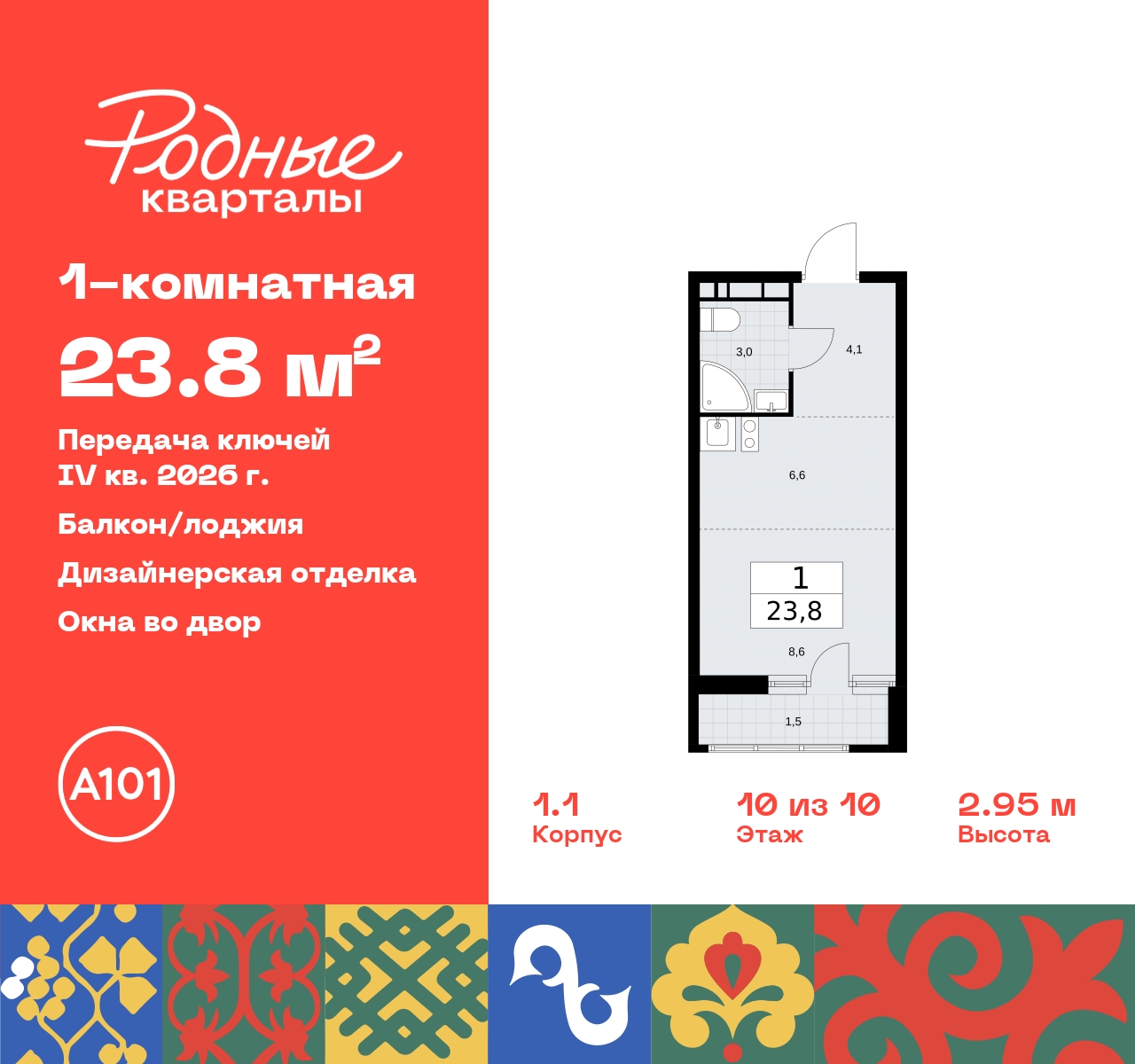 Продается 1-комн. квартира-студия от застройщика с отделкой в ЖК "Родные кварталы" на 10 этаже. Общая площадь: 23.8 кв.м., площадь гостиной 15.2 кв.м., из которых 6.6 кв.м. выделено под кухонную зону. Все окна выходят на одну сторону. В квартире один балкон, один совмещенный санузел. Высота потолков 2.9 м. Квартира находится в корпусе 1.1. Дом монолитный, одноподъездный, высотой 10 этажей. На этаже 11 квартир. В подъезде 1 пассажирский и 1 грузовой лифт. Начало строительства - 4 квартал 2023 года. Окончание строительства - 4 квартал 2026 года. Оформление сделки по договору долевого участия. Артикул квартиры по базе застройщика 96К-1.1-91. ПРЕДЛОЖЕНИЯ ОТ ЗАСТРОЙЩИКА В ОКТЯБРЕ 2025: Ипотека от 13,9 % для всех! На весь срок. "Семейная ипотека" вернулась. Ставка от 3,5 % на весь срок! Без удорожания! Выгодное ипотечное комбо: Ипотека от 2200 р./мес. и от 6 % после рождения ребёнка! Ипотека для всех "Держи пять!" - ставка 5 % на 2 года! *более подробную информацию по скидкам и акциям уточняйте в отделе продаж Новый жилой комплекс "Родные кварталы" строится в уютной, экологически благополучной локации на юго-западе столицы. В ближайшем окружении – ухоженные малоэтажные посёлки и живописный Ульяновский лесопарк. Благодаря этому из окон откроются вдохновляющие виды, которые не исчезнут со временем за фасадами многоэтажек. Через весь район пройдёт главный бульвар, который свяжет набережную, жилые кварталы и площади в единое дружелюбное пространство, органично наполненное узнаваемыми элементами культурных традиций разных народов. В жилом комплексе создаются условия для комфортного отдыха и занятий спортом всех жителей. Здесь можно прогуляться и отдохнуть в лесопарке на берегу ручья, позаниматься на тренажёрах под открытым небом и спортивных площадках. Для малышей построят игровые комплексы, развивающие силу, координацию и ловкость. Всего в жилом комплексе будет оборудовано 6 га территории для спокойного отдыха и около 9 га — для активного. Подъезды в домах освещены в любое время суток, входы и вестибюль хорошо просматриваются с улицы. Витражное остекление обеспечивает приток естественного света днём, а вечером зажигаются светильники. В отделке домов используется сочетание вентилируемого фасада с облицовкой из фибробетонной плитки и штукатуркой. Комфортная высота домов соразмерна человеку и в среднем составляет 10 этажей. Все дома обеспечены собственными подземными паркингами. В них размещаются машино-места и кладовые. В паркинг или кладовую можно спуститься на лифте или по лестнице. В комплексе появятся бытовые сервисы, магазины, аптеки и другие торгово-бытовые объекты. В жилом районе «Родные кварталы» будут построены: - образовательный центр: школа на 1300 учеников и детский сад на 250 малышей, - два детских сада на 200 мест каждый (один из них сдаётся в 1-й очереди). В транспортной доступности уже работают: - школа № 41 и детский сад — по Боровскому шоссе, - школа № 2057 и детский сад — на запад от района, в дер. Марушкино. ЖК «Родные кварталы» строится в Новомосковском округе столицы, в 15 минутах на автомобиле от аэропорта «Внуково». Район обеспечен удобными выездами на три крупные современные автотрассы. Здесь уже работает и активно развивается система наземного общественного транспорта, включая междугородние рейсы. Интенсивное развитие локации обеспечивают две действующие станци