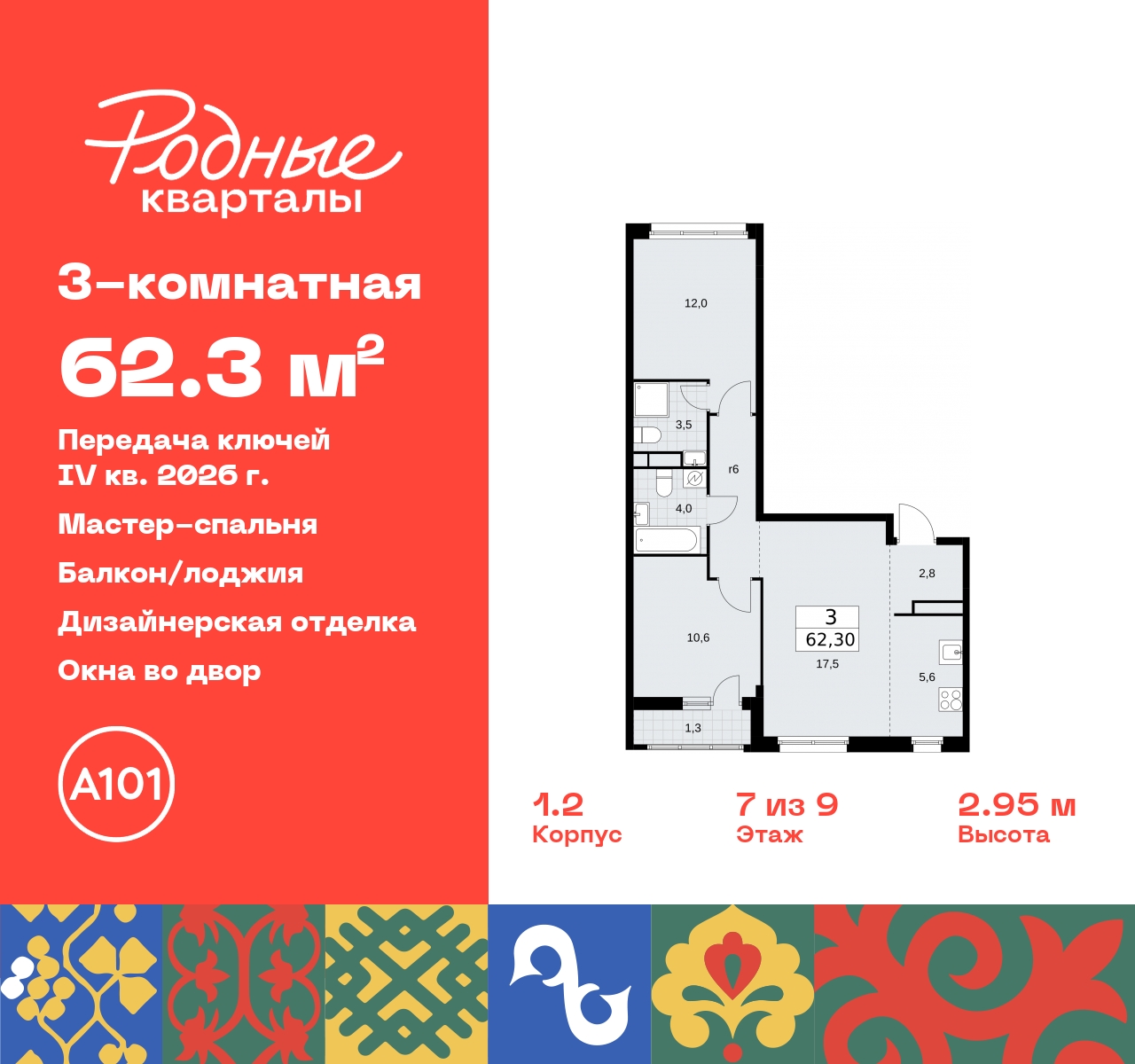 3-комн. квартира с европланировкой и отделкой в ЖК "Родные кварталы" на 7 этаже. Общая площадь: 62.3 кв.м., жилая: 40.1 кв.м., суммарная площадь гостиной-столовой с кухонной зоной: 23.1 кв.м. Европейская планировка, за счет большой площади кухни-гостиной квартира выглядит просторной и очень удобна для жизни. Квартира - распашонка, без проходных комнат, окна выходят на paзные стороны дома. В квартире одна лоджия, два совмещенных санузла. Высота потолков 2.9 м. Дом монолитный, многоподъездный, высотой 9 этажей. Квартира находится в 5-й секции в корпусе 1.2. На этаже 7 квартир. В подъезде 1 грузовой лифт. Начало строительства - 4 квартал 2023 года. Окончание строительства - 4 квартал 2026 года. Оформление сделки по договору долевого участия. Артикул квартиры по базе застройщика 96К-1.2-327. Новый жилой комплекс "Родные кварталы" строится в уютной, экологически благополучной локации на юго-западе столицы. В ближайшем окружении – ухоженные малоэтажные посёлки и живописный Ульяновский лесопарк. Благодаря этому из окон откроются вдохновляющие виды, которые не исчезнут со временем за фасадами многоэтажек. Через весь район пройдёт главный бульвар, который свяжет набережную, жилые кварталы и площади в единое дружелюбное пространство, органично наполненное узнаваемыми элементами культурных традиций разных народов. В жилом комплексе создаются условия для комфортного отдыха и занятий спортом всех жителей. Здесь можно прогуляться и отдохнуть в лесопарке на берегу ручья, позаниматься на тренажёрах под открытым небом и спортивных площадках. Для малышей построят игровые комплексы, развивающие силу, координацию и ловкость. Всего в жилом комплексе будет оборудовано 6 га территории для спокойного отдыха и около 9 га — для активного. Подъезды в домах освещены в любое время суток, входы и вестибюль хорошо просматриваются с улицы. Витражное остекление обеспечивает приток естественного света днём, а вечером зажигаются светильники. В отделке домов используется сочетание вентилируемого фасада с облицовкой из фибробетонной плитки и штукатуркой. Комфортная высота домов соразмерна человеку и в среднем составляет 10 этажей. Все дома обеспечены собственными подземными паркингами. В них размещаются машино-места и кладовые. В паркинг или кладовую можно спуститься на лифте или по лестнице. В комплексе появятся бытовые сервисы, магазины, аптеки и другие торгово-бытовые объекты. В жилом районе «Родные кварталы» будут построены: - образовательный центр: школа на 1300 учеников и детский сад на 250 малышей, - два детских сада на 200 мест каждый (один из них сдаётся в 1-й очереди). В транспортной доступности уже работают: - школа № 41 и детский сад — по Боровскому шоссе, - школа № 2057 и детский сад — на запад от района, в дер. Марушкино. ЖК «Родные кварталы» строится в Новомосковском округе столицы, в 15 минутах на автомобиле от аэропорта «Внуково». Район обеспечен удобными выездами на три крупные современные автотрассы. Здесь уже работает и активно развивается система наземного общественного транспорта, включая междугородние рейсы. Интенсивное развитие локации обеспечивают две действующие станции крупных транспортных линий: метро (станция «Внуково») и МЦД (станция «Толстопальцево»). (AQID02318023)