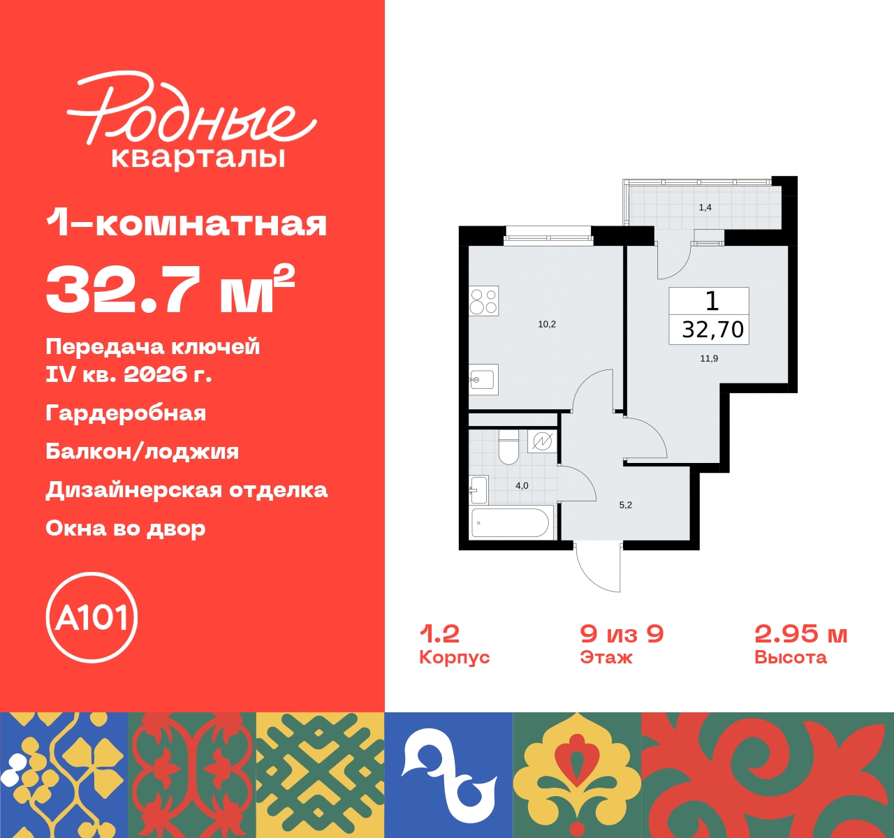 1-комн. квартира-студия от застройщика с отделкой в ЖК "Родные кварталы" на 9 этаже. Общая площадь: 32.7 кв.м., площадь гостиной 22.1 кв.м., из которых 10.2 кв.м. выделено под кухонную зону. Все окна выходят на одну сторону. В квартире один балкон, один совмещенный санузел. Высота потолков 2.9 м. Имеется ниша под гардероб. Дом монолитный, многоподъездный, высотой 9 этажей. Квартира находится в 5-й секции в корпусе 1.2. На этаже 7 квартир. В подъезде 1 грузовой лифт. Начало строительства - 4 квартал 2023 года. Окончание строительства - 4 квартал 2026 года. Оформление сделки по договору долевого участия. Артикул квартиры по базе застройщика 96К-1.2-343. Новый жилой комплекс "Родные кварталы" строится в уютной, экологически благополучной локации на юго-западе столицы. В ближайшем окружении – ухоженные малоэтажные посёлки и живописный Ульяновский лесопарк. Благодаря этому из окон откроются вдохновляющие виды, которые не исчезнут со временем за фасадами многоэтажек. Через весь район пройдёт главный бульвар, который свяжет набережную, жилые кварталы и площади в единое дружелюбное пространство, органично наполненное узнаваемыми элементами культурных традиций разных народов. В жилом комплексе создаются условия для комфортного отдыха и занятий спортом всех жителей. Здесь можно прогуляться и отдохнуть в лесопарке на берегу ручья, позаниматься на тренажёрах под открытым небом и спортивных площадках. Для малышей построят игровые комплексы, развивающие силу, координацию и ловкость. Всего в жилом комплексе будет оборудовано 6 га территории для спокойного отдыха и около 9 га — для активного. Подъезды в домах освещены в любое время суток, входы и вестибюль хорошо просматриваются с улицы. Витражное остекление обеспечивает приток естественного света днём, а вечером зажигаются светильники. В отделке домов используется сочетание вентилируемого фасада с облицовкой из фибробетонной плитки и штукатуркой. Комфортная высота домов соразмерна человеку и в среднем составляет 10 этажей. Все дома обеспечены собственными подземными паркингами. В них размещаются машино-места и кладовые. В паркинг или кладовую можно спуститься на лифте или по лестнице. В комплексе появятся бытовые сервисы, магазины, аптеки и другие торгово-бытовые объекты. В жилом районе «Родные кварталы» будут построены: - образовательный центр: школа на 1300 учеников и детский сад на 250 малышей, - два детских сада на 200 мест каждый (один из них сдаётся в 1-й очереди). В транспортной доступности уже работают: - школа № 41 и детский сад — по Боровскому шоссе, - школа № 2057 и детский сад — на запад от района, в дер. Марушкино. ЖК «Родные кварталы» строится в Новомосковском округе столицы, в 15 минутах на автомобиле от аэропорта «Внуково». Район обеспечен удобными выездами на три крупные современные автотрассы. Здесь уже работает и активно развивается система наземного общественного транспорта, включая междугородние рейсы. Интенсивное развитие локации обеспечивают две действующие станции крупных транспортных линий: метро (станция «Внуково») и МЦД (станция «Толстопальцево»). (AQID02318057)