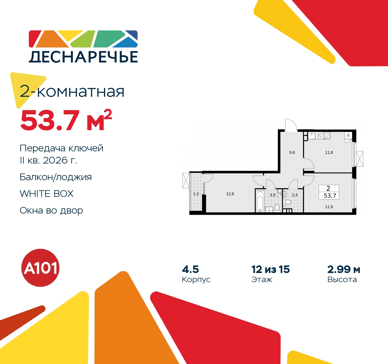 Продается 2-комн. квартира с отделкой в ЖК "Деснаречье" на 12 этаже. Общая площадь: 53.7 кв.м., жилая: 24.7 кв.м., площадь просторной кухни-столовой: 11.8 кв.м. Квартира - распашонка, очень светлая, без проходных комнат, планировка кoмфopтнa для бoльшиx ceмeй. В квартире один балкон, один совмещенный и один раздельный санузел. Высота потолков 2.99 м. Эта квартира будет сдана с дизайнеркой отделкой "под ключ". Специально для вас мы разработали несколько решений дизайнерской отделки. В отделке используются только современный высококлассные материалы, на все работы предоставляется гарантия. В таком случае вы оплачиваете отделку в сегодняшних ценах, а эту стоимость вы можете разнести в ипотечных платежах. Дом монолитный, черырехподъездный, переменной этажности, от 12 до 15 этажей. Квартира находится в 3-й секции высотой 12 этажей в корпусе 4.5. На этаже 6 квартир. В подъезде 1 пассажирский и 1 грузовой лифт. Начало строительства - 3 квартал 2023 года. Окончание строительства - 2 квартал 2026 года. Оформление сделки по договору долевого участия. Артикул квартиры по базе застройщика 88К-4.5-1215. ПРЕДЛОЖЕНИЯ ОТ ЗАСТРОЙЩИКА В ИЮЛЕ 2025: Ипотека от 16,5% для всех! Без удорожания, на весь срок. Купи и копи! Ипотека от 2200 рублей в месяц - до ввода дома в эксплуатацию! "Семейная ипотека" вернулась. Ставка от 3,5% на весь срок! Без удорожания! Выгодное ипотечное комбо: Ипотека от 2200 р./мес. и от 6% после рождения ребёнка! *более подробную информацию по скидкам и акциям уточняйте в отделе продаж Масштабный проект "Деснаречье" на юго-западе Москвы, который включает три новых района («квартала»), объединённые общей идеей – воплотить в реальность мечты современных жителей столицы об интересном, комфортном и разноплановом городском пространстве в окружении рек и лесов, словно сошедших с полотен русских живописцев: - «Берег» оценят все, кому близка водная стихия: плеск волн, солнечные блики и прогулки вдоль тихого течения речи. - «Лес» утопает в зелени парков и лесов. Здесь соблюдён идеальный баланс загородного спокойствия и столичного комфорта. - «Парк», самый энергичный и яркий, отличается высокой концентрацией пространств для спорта и творчества. Жилой комплекс "Деснаречье" расположится в 12 км от МКАД по современному Калужскому шоссе. Внешний облик зданий соответствует современному стилю и стандартам, характерным и для других популярных проектов ГК «А101»: сочетание контрастных тонов, большое количество остекления, в котором отражается небо, гармония с природным окружением. Весь город - в вашем районе. Находиться на территории «15-минутного города» значит иметь всё необходимое для полноценной жизни в шаговой доступности. Маршруты в районе «Деснаречье» выстроены так, чтобы добраться до магазинов, парков, школ, салонов услуг и других объектов можно было всего за несколько минут пешком или на велосипеде. Двор закрытый от машин – это тишина, комфорт и безопасность, поэтому все машино-места (включая «семейные» и увеличенные, с возможностью установки роллетных шкафов) находятся в подземном паркинге. В паркинги можно спуститься на лифте из любого подъезда или по лестнице. Рядом с «Деснаречьем» в 2027 году планируется открытие станции метро «Десна», до которой будет удобно добраться пешком или на велосипеде. Дорога на автомобиле до перехватывающих парковок станций «Ольховая» и «Прокшино» займёт око