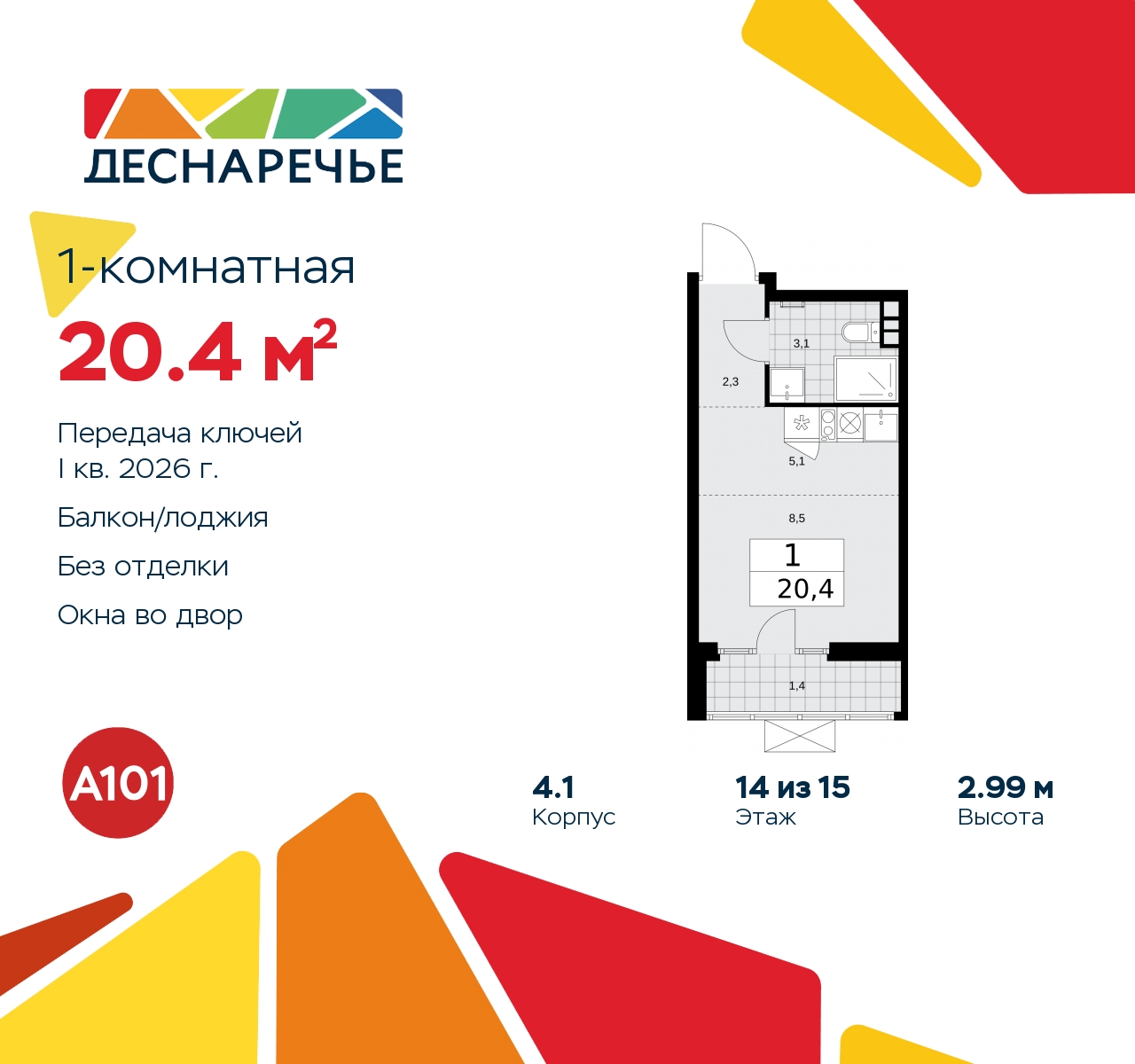 Продается однокомнатная квартира-студия в ЖК "Деснаречье" на 14 этаже. Квартира без отделки, после выдачи ключей можно делать ремонт. Общая площадь: 20.4 кв.м., площадь гостиной 13.6 кв.м., из которых 5.1 кв.м. выделено под кухонную зону. Все окна выходят на одну сторону. В квартире один балкон, один совмещенный санузел. Высота потолков 2.99 м. Эта квартира предлагается без отделки. Будут установлены стеклопакеты с повышенной тепло- и шумоизоляцией, в квартиру заведены все коммуникации. Вы сможете в полном объеме реализовать ваши идеи обустройства вашего комфортного дома. Для тех, кто ценит время и не хочет дополнительных трат на ремонт мы предлагаем квартиры с предчистовой и дизайнерской отделкой. Дом монолитный, трехподъездный, высотой 15 этажей. Квартира находится в 1-й секции в корпусе 4.1. На этаже 6 квартир. В подъезде 1 пассажирский и 1 грузовой лифт. Начало строительства - 3 квартал 2023 года. Окончание строительства - 1 квартал 2026 года. Оформление сделки по договору долевого участия. Артикул квартиры по базе застройщика 88К-4.1-76. ПРЕДЛОЖЕНИЯ ОТ ЗАСТРОЙЩИКА В ОКТЯБРЕ 2025: Ипотека от 13,9 % для всех! На весь срок. "Семейная ипотека" вернулась. Ставка от 3,5 % на весь срок! Без удорожания! Выгодное ипотечное комбо: Ипотека от 2200 р./мес. и от 6 % после рождения ребёнка! Ипотека для всех "Держи пять!" - ставка 5 % на 2 года! *более подробную информацию по скидкам и акциям уточняйте в отделе продаж Масштабный проект "Деснаречье" на юго-западе Москвы, который включает три новых района («квартала»), объединённые общей идеей – воплотить в реальность мечты современных жителей столицы об интересном, комфортном и разноплановом городском пространстве в окружении рек и лесов, словно сошедших с полотен русских живописцев: - «Берег» оценят все, кому близка водная стихия: плеск волн, солнечные блики и прогулки вдоль тихого течения речи. - «Лес» утопает в зелени парков и лесов. Здесь соблюдён идеальный баланс загородного спокойствия и столичного комфорта. - «Парк», самый энергичный и яркий, отличается высокой концентрацией пространств для спорта и творчества. Жилой комплекс "Деснаречье" расположится в 12 км от МКАД по современному Калужскому шоссе. Внешний облик зданий соответствует современному стилю и стандартам, характерным и для других популярных проектов ГК «А101»: сочетание контрастных тонов, большое количество остекления, в котором отражается небо, гармония с природным окружением. Весь город - в вашем районе. Находиться на территории «15-минутного города» значит иметь всё необходимое для полноценной жизни в шаговой доступности. Маршруты в районе «Деснаречье» выстроены так, чтобы добраться до магазинов, парков, школ, салонов услуг и других объектов можно было всего за несколько минут пешком или на велосипеде. Двор закрытый от машин – это тишина, комфорт и безопасность, поэтому все машино-места (включая «семейные» и увеличенные, с возможностью установки роллетных шкафов) находятся в подземном паркинге. В паркинги можно спуститься на лифте из любого подъезда или по лестнице. Рядом с «Деснаречьем» в 2027 году планируется открытие станции метро «Десна», до которой будет удобно добраться пешком или на велосипеде. Дорога на автомобиле до перехватывающих парковок станций «Ольховая» и «Прокшино» займёт около 10 минут. В процессе реализации проекта будут появляться новые маршр