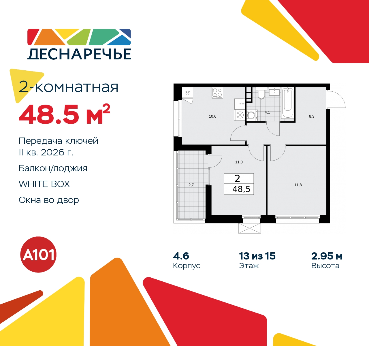 Просторная 2-комн. квартира с отделкой в ЖК "Деснаречье" на 13 этаже. Общая площадь: 48.5 кв.м., жилая: 22.8 кв.м., площадь просторной кухни-столовой: 10.6 кв.м. Угловая квартира, очень светлая, естественная вентиляция при открытии окон. В квартире одна лоджия, один совмещенный санузел. Высота потолков 2.95 м. Эта квартира будет сдана с дизайнеркой отделкой "под ключ". Специально для вас мы разработали несколько решений дизайнерской отделки. В отделке используются только современный высококлассные материалы, на все работы предоставляется гарантия. В таком случае вы оплачиваете отделку в сегодняшних ценах, а эту стоимость вы можете разнести в ипотечных платежах. Квартира находится в корпусе 4.6. Дом монолитный, одноподъездный, высотой 15 этажей. На этаже 10 квартир. В подъезде 1 пассажирский и 1 грузовой лифт. Начало строительства - 3 квартал 2023 года. Окончание строительства - 2 квартал 2026 года. Оформление сделки по договору долевого участия. Артикул квартиры по базе застройщика 88К-4.6-1419. ПРЕДЛОЖЕНИЯ ОТ ЗАСТРОЙЩИКА В ОКТЯБРЕ 2025: Ипотека от 13,9 % для всех! На весь срок. "Семейная ипотека" вернулась. Ставка от 3,5 % на весь срок! Без удорожания! Выгодное ипотечное комбо: Ипотека от 2200 р./мес. и от 6 % после рождения ребёнка! Ипотека для всех "Держи пять!" - ставка 5 % на 2 года! *более подробную информацию по скидкам и акциям уточняйте в отделе продаж Масштабный проект "Деснаречье" на юго-западе Москвы, который включает три новых района («квартала»), объединённые общей идеей – воплотить в реальность мечты современных жителей столицы об интересном, комфортном и разноплановом городском пространстве в окружении рек и лесов, словно сошедших с полотен русских живописцев: - «Берег» оценят все, кому близка водная стихия: плеск волн, солнечные блики и прогулки вдоль тихого течения речи. - «Лес» утопает в зелени парков и лесов. Здесь соблюдён идеальный баланс загородного спокойствия и столичного комфорта. - «Парк», самый энергичный и яркий, отличается высокой концентрацией пространств для спорта и творчества. Жилой комплекс "Деснаречье" расположится в 12 км от МКАД по современному Калужскому шоссе. Внешний облик зданий соответствует современному стилю и стандартам, характерным и для других популярных проектов ГК «А101»: сочетание контрастных тонов, большое количество остекления, в котором отражается небо, гармония с природным окружением. Весь город - в вашем районе. Находиться на территории «15-минутного города» значит иметь всё необходимое для полноценной жизни в шаговой доступности. Маршруты в районе «Деснаречье» выстроены так, чтобы добраться до магазинов, парков, школ, салонов услуг и других объектов можно было всего за несколько минут пешком или на велосипеде. Двор закрытый от машин – это тишина, комфорт и безопасность, поэтому все машино-места (включая «семейные» и увеличенные, с возможностью установки роллетных шкафов) находятся в подземном паркинге. В паркинги можно спуститься на лифте из любого подъезда или по лестнице. Рядом с «Деснаречьем» в 2027 году планируется открытие станции метро «Десна», до которой будет удобно добраться пешком или на велосипеде. Дорога на автомобиле до перехватывающих парковок станций «Ольховая» и «Прокшино» займёт около 10 минут. В процессе реализации проекта будут появляться новые маршруты общественного транспорта по районам. Уже сейч