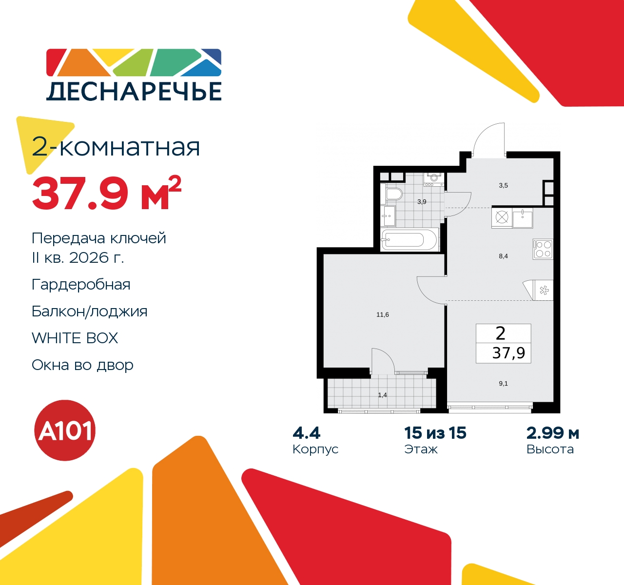 Двухкомнатная квартира с европланировкой и отделкой в ЖК "Деснаречье" на 15 этаже. Общая площадь: 37.9 кв.м., жилая: 20.7 кв.м., общая площадь гостиной-столовой с кухонной зоной: 17.5 кв.м. Европейская планировка, зона гостиной комнаты объединена с кухней. Комнаты изолированные, все окна выходят на одну сторону. В квартире одна лоджия, один совмещенный санузел. Высота потолков 2.99 м. Эта квартира будет сдана с дизайнеркой отделкой "под ключ". Специально для вас мы разработали несколько решений дизайнерской отделки. В отделке используются только современный высококлассные материалы, на все работы предоставляется гарантия. В таком случае вы оплачиваете отделку в сегодняшних ценах, а эту стоимость вы можете разнести в ипотечных платежах. Имеется ниша под гардероб. Дом монолитный, черырехподъездный, высотой 15 этажей. Квартира находится в 4-й секции в корпусе 4.4. На этаже 6 квартир. В подъезде 1 пассажирский и 1 грузовой лифт. Начало строительства - 3 квартал 2023 года. Окончание строительства - 2 квартал 2026 года. Оформление сделки по договору долевого участия. Артикул квартиры по базе застройщика 88К-4.4-1041. ПРЕДЛОЖЕНИЯ ОТ ЗАСТРОЙЩИКА В ОКТЯБРЕ 2025: Ипотека от 13,9 % для всех! На весь срок. "Семейная ипотека" вернулась. Ставка от 3,5 % на весь срок! Без удорожания! Выгодное ипотечное комбо: Ипотека от 2200 р./мес. и от 6 % после рождения ребёнка! Ипотека для всех "Держи пять!" - ставка 5 % на 2 года! *более подробную информацию по скидкам и акциям уточняйте в отделе продаж Масштабный проект "Деснаречье" на юго-западе Москвы, который включает три новых района («квартала»), объединённые общей идеей – воплотить в реальность мечты современных жителей столицы об интересном, комфортном и разноплановом городском пространстве в окружении рек и лесов, словно сошедших с полотен русских живописцев: - «Берег» оценят все, кому близка водная стихия: плеск волн, солнечные блики и прогулки вдоль тихого течения речи. - «Лес» утопает в зелени парков и лесов. Здесь соблюдён идеальный баланс загородного спокойствия и столичного комфорта. - «Парк», самый энергичный и яркий, отличается высокой концентрацией пространств для спорта и творчества. Жилой комплекс "Деснаречье" расположится в 12 км от МКАД по современному Калужскому шоссе. Внешний облик зданий соответствует современному стилю и стандартам, характерным и для других популярных проектов ГК «А101»: сочетание контрастных тонов, большое количество остекления, в котором отражается небо, гармония с природным окружением. Весь город - в вашем районе. Находиться на территории «15-минутного города» значит иметь всё необходимое для полноценной жизни в шаговой доступности. Маршруты в районе «Деснаречье» выстроены так, чтобы добраться до магазинов, парков, школ, салонов услуг и других объектов можно было всего за несколько минут пешком или на велосипеде. Двор закрытый от машин – это тишина, комфорт и безопасность, поэтому все машино-места (включая «семейные» и увеличенные, с возможностью установки роллетных шкафов) находятся в подземном паркинге. В паркинги можно спуститься на лифте из любого подъезда или по лестнице. Рядом с «Деснаречьем» в 2027 году планируется открытие станции метро «Десна», до которой будет удобно добраться пешком или на велосипеде. Дорога на автомобиле до перехватывающих парковок станций «Ольховая» и «Прокшино» займёт окол