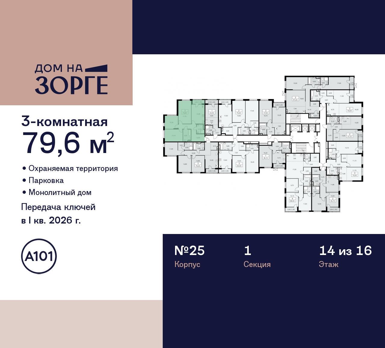 Продается 3-комн. квартира с предчистовой отделкой в ЖК "Дом на Зорге" на 14 этаже. Общая площадь: 79.6 кв.м., жилая: 41.1 кв.м., площадь просторной кухни-столовой: 14.9 кв.м. Квартира угловая, окна oбecпeчивaют paвнoмepнoe ocвeщeниe в тeчeниe дня. В квартире одна лоджия, два совмещенных санузла. Высота потолков 3.1 м. Дом монолитный, двухподъездный, высотой 16 этажей. Квартира находится в 1-й секции в корпусе 25. На этаже 13 квартир. В подъезде 2 пассажирских и 1 грузовой лифт. Начало строительства - 2 квартал 2023 года. Окончание строительства - 1 квартал 2026 года. Оформление сделки по договору долевого участия. Артикул квартиры по базе застройщика 25К-25-166. В шаговой доступности от дома находятся станции метро (расстояние по прямой): «Зорге» (500 м), «Октябрьское поле» (800 м), «Панфиловская» (900 м), «Сокол» (1.6 км), «Хорошево» (1.6 км). ПРЕДЛОЖЕНИЯ ОТ ЗАСТРОЙЩИКА В ОКТЯБРЕ 2025: Ипотека от 13,9 % для всех! На весь срок. "Семейная ипотека" вернулась. Ставка от 3,5 % на весь срок! Без удорожания! Выгодное ипотечное комбо: Ипотека от 2200 р./мес. и от 6 % после рождения ребёнка! Ипотека для всех "Держи пять!" - ставка 5 % на 2 года! *более подробную информацию по скидкам и акциям уточняйте в отделе продаж "Дом на Зорге"» бизнес-класса возводится в престижном районе «Сокол» с исторической «сталинской» застройкой и статусными жилыми комплексами на границе с Хорошёвским районом Северо-Западного АО. До действующей станции метро (и МЦК) «Зорге» всего 350 метров. «Дом на Зорге» отличается элегантным и статусным внешним видом – идеально соответствует «дресс-коду» исторического окружения и в тоже время обращает на себя внимание. Вентилируемые фасады облицованы фиброцементными и керамогранитными панелями, которые повторяют фактуру натурального камня и бетона. Кондиционеры скроют корзины и стильные блоки, расположенные в декоративных элементах фасада. Мягкая архитектурно-художественная подсветка подчеркнёт благородный экстерьер дома. Сформированная инфраструктура района предоставит жителям богатый выбор мест для отдыха, шопинга и занятий спортом. На первом этаже «Дома на Зорге» откроются уютные магазины, атмосферные кафе и салоны красоты с отличным сервисом. Здесь предусмотрено всё для удобства, позитивного настроения и безопасности жителей. В закрытый двор не войдут посторонние. Автомобили останутся за периметром или в подземном паркинге. Две 16-этажных секции дома соединит лобби с дизайнерской отделкой. Оно станет стильным общественным пространством и главным входом для жителей, также ведущим в скрытый от посторонних глаз приватный внутренний двор. Всего в локации – более четырёх десятков разнообразных учебных учреждений для детей, включая легендарную «Курчатовскую школу». В шаговой доступности находятся корпуса школы № 1251 имени генерала Шарля де Голля – с дошкольным отделением. На территории дома будут благоустроены общий и приватный (доступный только жителям) дворы. Дизайн каждой функциональной зоны уникален, а вместе они подчёркивают благородный архитектурный стиль здания. В основе цветовых решений – «отражение» фасадов, мягкие природные оттенки. (AQID02221132)
