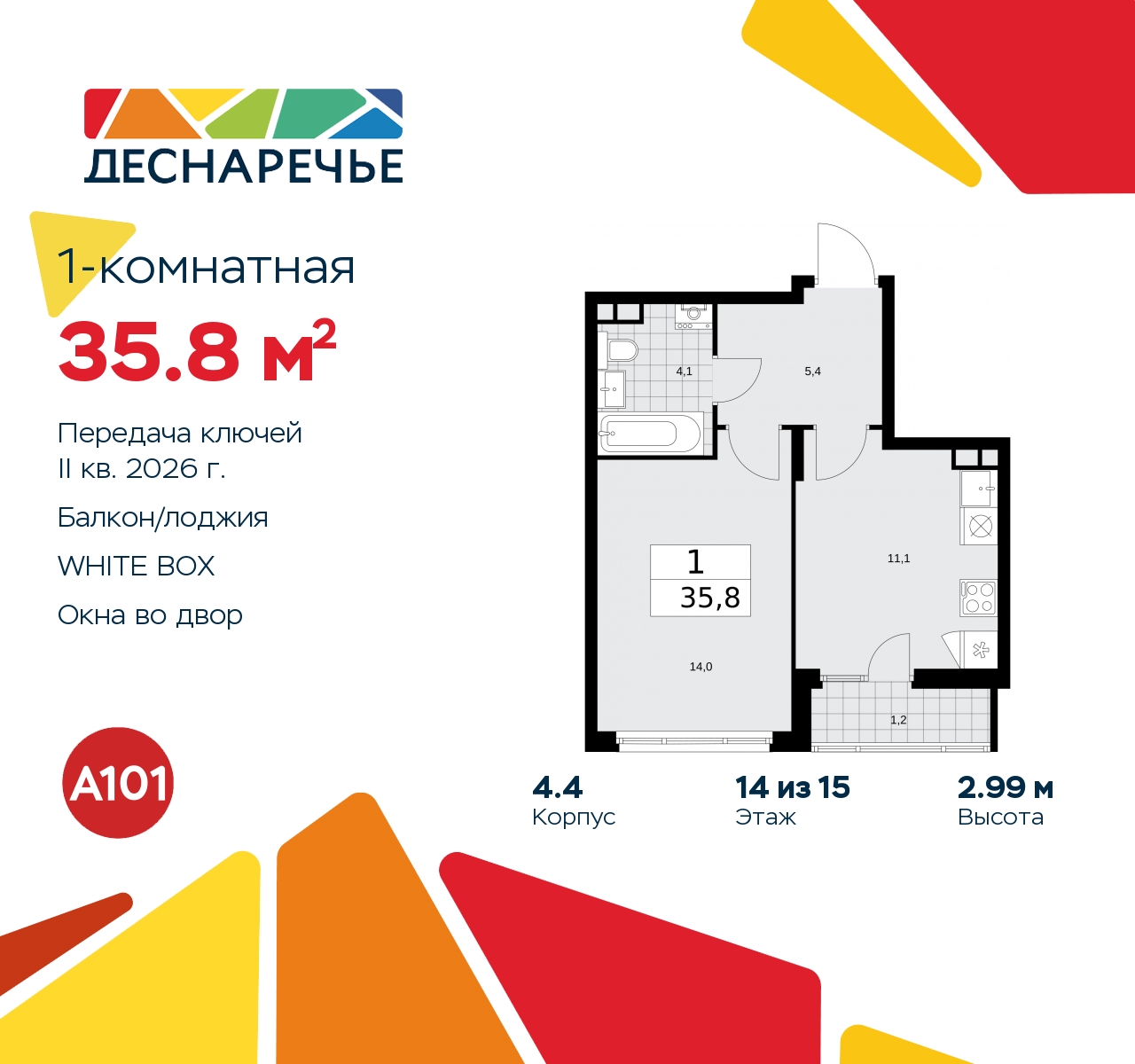 1-комн. квартира от застройщика с отделкой в ЖК "Деснаречье" на 14 этаже. Общая площадь: 35.8 кв.м., жилая: 14 кв.м., площадь просторной кухни-столовой: 11.1 кв.м. Все окна выходят на одну сторону. В квартире одна лоджия, один совмещенный санузел. Высота потолков 2.99 м. Эта квартира будет сдана с дизайнеркой отделкой "под ключ". Специально для вас мы разработали несколько решений дизайнерской отделки. В отделке используются только современный высококлассные материалы, на все работы предоставляется гарантия. В таком случае вы оплачиваете отделку в сегодняшних ценах, а эту стоимость вы можете разнести в ипотечных платежах. Дом монолитный, черырехподъездный, высотой 15 этажей. Квартира находится в 3-й секции в корпусе 4.4. На этаже 5 квартир. В подъезде 1 пассажирский и 1 грузовой лифт. Начало строительства - 3 квартал 2023 года. Окончание строительства - 2 квартал 2026 года. Оформление сделки по договору долевого участия. Артикул квартиры по базе застройщика 88К-4.4-954. ПРЕДЛОЖЕНИЯ ОТ ЗАСТРОЙЩИКА В ИЮЛЕ 2025: Ипотека от 16,5% для всех! Без удорожания, на весь срок. Купи и копи! Ипотека от 2200 рублей в месяц - до ввода дома в эксплуатацию! "Семейная ипотека" вернулась. Ставка от 3,5% на весь срок! Без удорожания! Выгодное ипотечное комбо: Ипотека от 2200 р./мес. и от 6% после рождения ребёнка! *более подробную информацию по скидкам и акциям уточняйте в отделе продаж Масштабный проект "Деснаречье" на юго-западе Москвы, который включает три новых района («квартала»), объединённые общей идеей – воплотить в реальность мечты современных жителей столицы об интересном, комфортном и разноплановом городском пространстве в окружении рек и лесов, словно сошедших с полотен русских живописцев: - «Берег» оценят все, кому близка водная стихия: плеск волн, солнечные блики и прогулки вдоль тихого течения речи. - «Лес» утопает в зелени парков и лесов. Здесь соблюдён идеальный баланс загородного спокойствия и столичного комфорта. - «Парк», самый энергичный и яркий, отличается высокой концентрацией пространств для спорта и творчества. Жилой комплекс "Деснаречье" расположится в 12 км от МКАД по современному Калужскому шоссе. Внешний облик зданий соответствует современному стилю и стандартам, характерным и для других популярных проектов ГК «А101»: сочетание контрастных тонов, большое количество остекления, в котором отражается небо, гармония с природным окружением. Весь город - в вашем районе. Находиться на территории «15-минутного города» значит иметь всё необходимое для полноценной жизни в шаговой доступности. Маршруты в районе «Деснаречье» выстроены так, чтобы добраться до магазинов, парков, школ, салонов услуг и других объектов можно было всего за несколько минут пешком или на велосипеде. Двор закрытый от машин – это тишина, комфорт и безопасность, поэтому все машино-места (включая «семейные» и увеличенные, с возможностью установки роллетных шкафов) находятся в подземном паркинге. В паркинги можно спуститься на лифте из любого подъезда или по лестнице. Рядом с «Деснаречьем» в 2027 году планируется открытие станции метро «Десна», до которой будет удобно добраться пешком или на велосипеде. Дорога на автомобиле до перехватывающих парковок станций «Ольховая» и «Прокшино» займёт около 10 минут. В процессе реализации проекта будут появляться новые маршруты общественного транспорта по районам. Уж