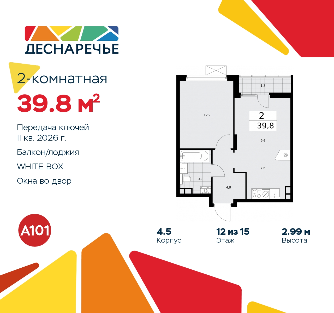 Продается двухкомнатная квартира с европланировкой и отделкой в ЖК "Деснаречье" на 12 этаже. Общая площадь: 39.8 кв.м., жилая: 21.8 кв.м., общая площадь гостиной-столовой с кухонной зоной: 17.2 кв.м. Европланировка, в просторной кухне-гостиной удобно как готовить, так и отдыхать. Комнаты изолированные, все окна выходят на одну сторону. В квартире одна лоджия, один совмещенный санузел. Высота потолков 2.99 м. Эта квартира будет сдана с дизайнеркой отделкой "под ключ". Специально для вас мы разработали несколько решений дизайнерской отделки. В отделке используются только современный высококлассные материалы, на все работы предоставляется гарантия. В таком случае вы оплачиваете отделку в сегодняшних ценах, а эту стоимость вы можете разнести в ипотечных платежах. Дом монолитный, черырехподъездный, переменной этажности, от 12 до 15 этажей. Квартира находится в 1-й секции высотой 12 этажей в корпусе 4.5. На этаже 5 квартир. В подъезде 1 пассажирский и 1 грузовой лифт. Начало строительства - 3 квартал 2023 года. Окончание строительства - 2 квартал 2026 года. Оформление сделки по договору долевого участия. Артикул квартиры по базе застройщика 88К-4.5-1098. ПРЕДЛОЖЕНИЯ ОТ ЗАСТРОЙЩИКА В ОКТЯБРЕ 2025: Ипотека от 13,9 % для всех! На весь срок. "Семейная ипотека" вернулась. Ставка от 3,5 % на весь срок! Без удорожания! Выгодное ипотечное комбо: Ипотека от 2200 р./мес. и от 6 % после рождения ребёнка! Ипотека для всех "Держи пять!" - ставка 5 % на 2 года! *более подробную информацию по скидкам и акциям уточняйте в отделе продаж Масштабный проект "Деснаречье" на юго-западе Москвы, который включает три новых района («квартала»), объединённые общей идеей – воплотить в реальность мечты современных жителей столицы об интересном, комфортном и разноплановом городском пространстве в окружении рек и лесов, словно сошедших с полотен русских живописцев: - «Берег» оценят все, кому близка водная стихия: плеск волн, солнечные блики и прогулки вдоль тихого течения речи. - «Лес» утопает в зелени парков и лесов. Здесь соблюдён идеальный баланс загородного спокойствия и столичного комфорта. - «Парк», самый энергичный и яркий, отличается высокой концентрацией пространств для спорта и творчества. Жилой комплекс "Деснаречье" расположится в 12 км от МКАД по современному Калужскому шоссе. Внешний облик зданий соответствует современному стилю и стандартам, характерным и для других популярных проектов ГК «А101»: сочетание контрастных тонов, большое количество остекления, в котором отражается небо, гармония с природным окружением. Весь город - в вашем районе. Находиться на территории «15-минутного города» значит иметь всё необходимое для полноценной жизни в шаговой доступности. Маршруты в районе «Деснаречье» выстроены так, чтобы добраться до магазинов, парков, школ, салонов услуг и других объектов можно было всего за несколько минут пешком или на велосипеде. Двор закрытый от машин – это тишина, комфорт и безопасность, поэтому все машино-места (включая «семейные» и увеличенные, с возможностью установки роллетных шкафов) находятся в подземном паркинге. В паркинги можно спуститься на лифте из любого подъезда или по лестнице. Рядом с «Деснаречьем» в 2027 году планируется открытие станции метро «Десна», до которой будет удобно добраться пешком или на велосипеде. Дорога на автомобиле до перехватывающих парковок станций «