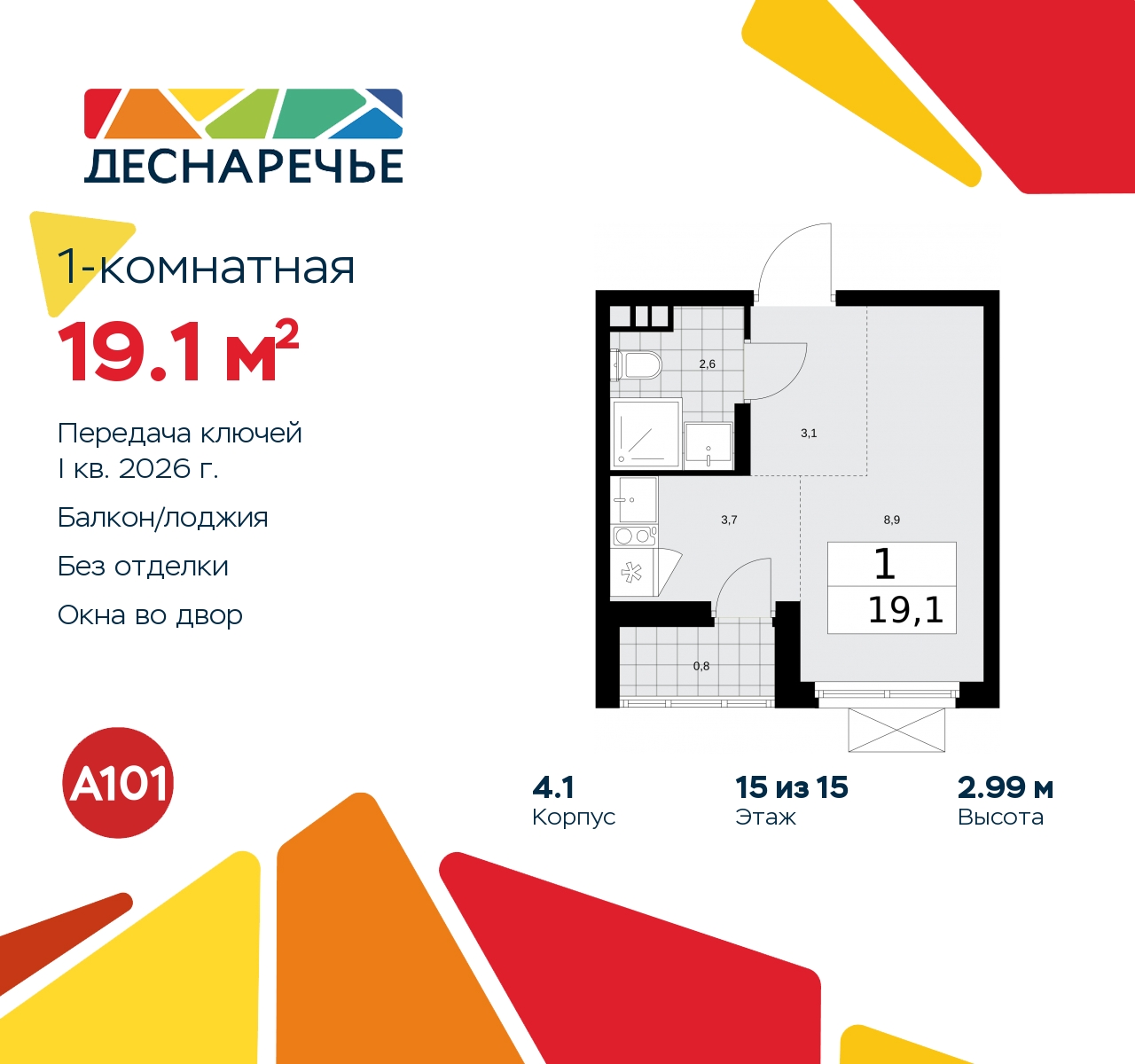 1-комн. квартира-студия в ЖК "Деснаречье" на 15 этаже. Квартира без отделки, новый собственник может сделать ремонт по индивидуальному проекту. Общая площадь: 19.1 кв.м., площадь гостиной 12.6 кв.м., из которых 3.7 кв.м. выделено под кухонную зону. Все окна выходят на одну сторону. В квартире одна лоджия, один совмещенный санузел. Высота потолков 2.99 м. Эта квартира предлагается без отделки. Будут установлены стеклопакеты с повышенной тепло- и шумоизоляцией, в квартиру заведены все коммуникации. Вы сможете в полном объеме реализовать ваши идеи обустройства вашего комфортного дома. Для тех, кто ценит время и не хочет дополнительных трат на ремонт мы предлагаем квартиры с предчистовой и дизайнерской отделкой. Дом монолитный, трехподъездный, высотой 15 этажей. Квартира находится во 2-й секции в корпусе 4.1. На этаже 7 квартир. В подъезде 1 пассажирский и 1 грузовой лифт. Начало строительства - 3 квартал 2023 года. Окончание строительства - 1 квартал 2026 года. Оформление сделки по договору долевого участия. Артикул квартиры по базе застройщика 88К-4.1-182. ПРЕДЛОЖЕНИЯ ОТ ЗАСТРОЙЩИКА В ОКТЯБРЕ 2025: Ипотека от 13,9 % для всех! На весь срок. "Семейная ипотека" вернулась. Ставка от 3,5 % на весь срок! Без удорожания! Выгодное ипотечное комбо: Ипотека от 2200 р./мес. и от 6 % после рождения ребёнка! Ипотека для всех "Держи пять!" - ставка 5 % на 2 года! *более подробную информацию по скидкам и акциям уточняйте в отделе продаж Масштабный проект "Деснаречье" на юго-западе Москвы, который включает три новых района («квартала»), объединённые общей идеей – воплотить в реальность мечты современных жителей столицы об интересном, комфортном и разноплановом городском пространстве в окружении рек и лесов, словно сошедших с полотен русских живописцев: - «Берег» оценят все, кому близка водная стихия: плеск волн, солнечные блики и прогулки вдоль тихого течения речи. - «Лес» утопает в зелени парков и лесов. Здесь соблюдён идеальный баланс загородного спокойствия и столичного комфорта. - «Парк», самый энергичный и яркий, отличается высокой концентрацией пространств для спорта и творчества. Жилой комплекс "Деснаречье" расположится в 12 км от МКАД по современному Калужскому шоссе. Внешний облик зданий соответствует современному стилю и стандартам, характерным и для других популярных проектов ГК «А101»: сочетание контрастных тонов, большое количество остекления, в котором отражается небо, гармония с природным окружением. Весь город - в вашем районе. Находиться на территории «15-минутного города» значит иметь всё необходимое для полноценной жизни в шаговой доступности. Маршруты в районе «Деснаречье» выстроены так, чтобы добраться до магазинов, парков, школ, салонов услуг и других объектов можно было всего за несколько минут пешком или на велосипеде. Двор закрытый от машин – это тишина, комфорт и безопасность, поэтому все машино-места (включая «семейные» и увеличенные, с возможностью установки роллетных шкафов) находятся в подземном паркинге. В паркинги можно спуститься на лифте из любого подъезда или по лестнице. Рядом с «Деснаречьем» в 2027 году планируется открытие станции метро «Десна», до которой будет удобно добраться пешком или на велосипеде. Дорога на автомобиле до перехватывающих парковок станций «Ольховая» и «Прокшино» займёт около 10 минут. В процессе реализации проекта будут появляться н