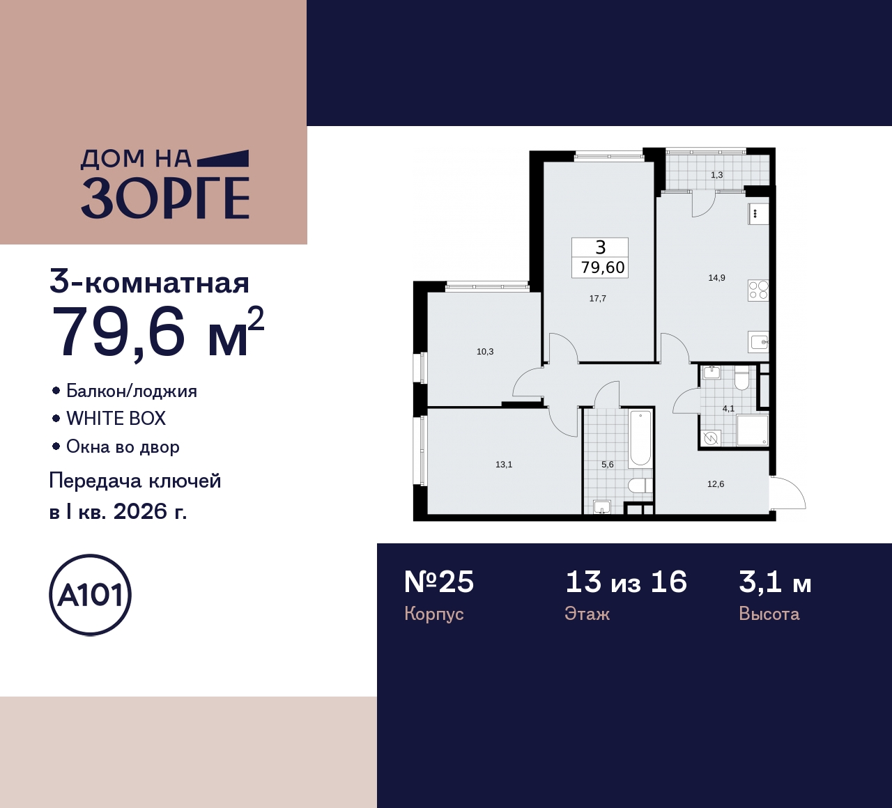3-комн. квартира с предчистовой отделкой в ЖК "Дом на Зорге" на 13 этаже. Общая площадь: 79.6 кв.м., жилая: 41.1 кв.м., площадь просторной кухни-столовой: 14.9 кв.м. Угловая квартира, идеально подойдет любителям тишины и панорамных видов. В квартире одна лоджия, два совмещенных санузла. Высота потолков 3.1 м. Дом монолитный, двухподъездный, высотой 16 этажей. Квартира находится в 1-й секции в корпусе 25. На этаже 13 квартир. В подъезде 2 пассажирских и 1 грузовой лифт. Начало строительства - 2 квартал 2023 года. Окончание строительства - 1 квартал 2026 года. Оформление сделки по договору долевого участия. Артикул квартиры по базе застройщика 25К-25-153. В шаговой доступности от дома имеются станции метро (расстояние по прямой): «Зорге» (500 м), «Октябрьское поле» (800 м), «Панфиловская» (900 м), «Сокол» (1.6 км), «Хорошево» (1.6 км). ПРЕДЛОЖЕНИЯ ОТ ЗАСТРОЙЩИКА В ОКТЯБРЕ 2025: Ипотека от 13,9 % для всех! На весь срок. "Семейная ипотека" вернулась. Ставка от 3,5 % на весь срок! Без удорожания! Выгодное ипотечное комбо: Ипотека от 2200 р./мес. и от 6 % после рождения ребёнка! Ипотека для всех "Держи пять!" - ставка 5 % на 2 года! *более подробную информацию по скидкам и акциям уточняйте в отделе продаж "Дом на Зорге"» бизнес-класса возводится в престижном районе «Сокол» с исторической «сталинской» застройкой и статусными жилыми комплексами на границе с Хорошёвским районом Северо-Западного АО. До действующей станции метро (и МЦК) «Зорге» всего 350 метров. «Дом на Зорге» отличается элегантным и статусным внешним видом – идеально соответствует «дресс-коду» исторического окружения и в тоже время обращает на себя внимание. Вентилируемые фасады облицованы фиброцементными и керамогранитными панелями, которые повторяют фактуру натурального камня и бетона. Кондиционеры скроют корзины и стильные блоки, расположенные в декоративных элементах фасада. Мягкая архитектурно-художественная подсветка подчеркнёт благородный экстерьер дома. Сформированная инфраструктура района предоставит жителям богатый выбор мест для отдыха, шопинга и занятий спортом. На первом этаже «Дома на Зорге» откроются уютные магазины, атмосферные кафе и салоны красоты с отличным сервисом. Здесь предусмотрено всё для удобства, позитивного настроения и безопасности жителей. В закрытый двор не войдут посторонние. Автомобили останутся за периметром или в подземном паркинге. Две 16-этажных секции дома соединит лобби с дизайнерской отделкой. Оно станет стильным общественным пространством и главным входом для жителей, также ведущим в скрытый от посторонних глаз приватный внутренний двор. Всего в локации – более четырёх десятков разнообразных учебных учреждений для детей, включая легендарную «Курчатовскую школу». В шаговой доступности находятся корпуса школы № 1251 имени генерала Шарля де Голля – с дошкольным отделением. На территории дома будут благоустроены общий и приватный (доступный только жителям) дворы. Дизайн каждой функциональной зоны уникален, а вместе они подчёркивают благородный архитектурный стиль здания. В основе цветовых решений – «отражение» фасадов, мягкие природные оттенки. (AQID02221119)