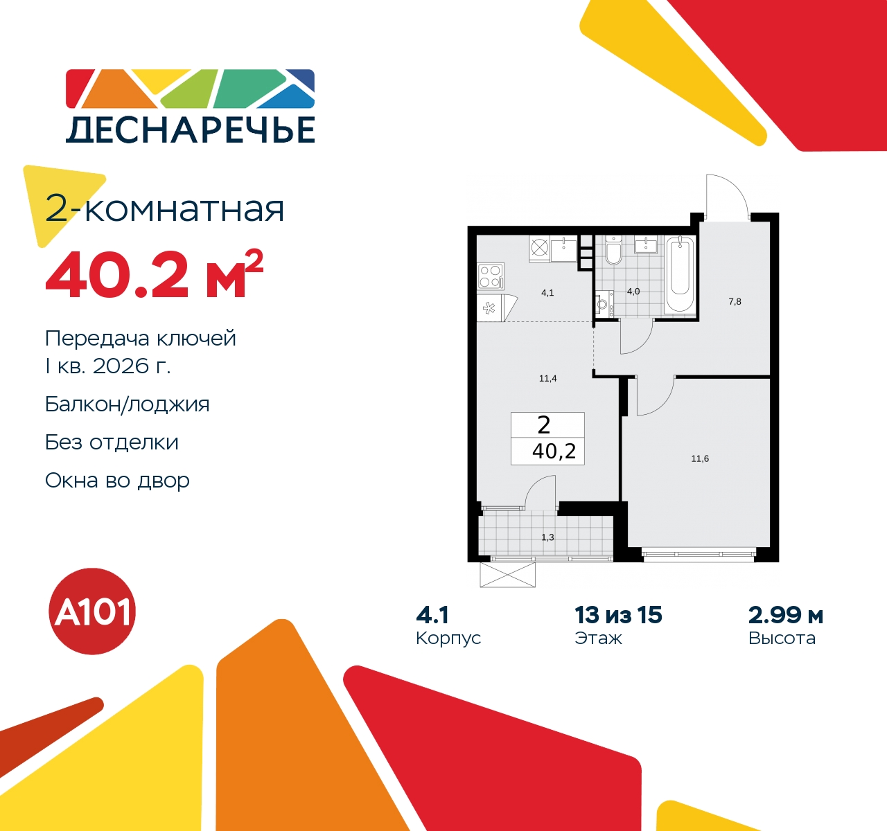 Продается 2-комн. квартира с европланировкой в ЖК "Деснаречье" на 13 этаже. Квартира без отделки, полностью готова к ремонту. Общая площадь: 40.2 кв.м., жилая: 23 кв.м., суммарная площадь гостиной-столовой с кухонной зоной: 15.5 кв.м. Европейская планировка, зона гостиной комнаты объединена с кухней. Комнаты изолированные, все окна выходят на одну сторону. В квартире одна лоджия, один совмещенный санузел. Высота потолков 2.99 м. Эта квартира предлагается без отделки. Будут установлены стеклопакеты с повышенной тепло- и шумоизоляцией, в квартиру заведены все коммуникации. Вы сможете в полном объеме реализовать ваши идеи обустройства вашего комфортного дома. Для тех, кто ценит время и не хочет дополнительных трат на ремонт мы предлагаем квартиры с предчистовой и дизайнерской отделкой. Дом монолитный, трехподъездный, высотой 15 этажей. Квартира находится в 3-й секции в корпусе 4.1. На этаже 6 квартир. В подъезде 1 пассажирский и 1 грузовой лифт. Начало строительства - 3 квартал 2023 года. Окончание строительства - 1 квартал 2026 года. Оформление сделки по договору долевого участия. Артикул квартиры по базе застройщика 88К-4.1-253. ПРЕДЛОЖЕНИЯ ОТ ЗАСТРОЙЩИКА В ОКТЯБРЕ 2025: Ипотека от 13,9 % для всех! На весь срок. "Семейная ипотека" вернулась. Ставка от 3,5 % на весь срок! Без удорожания! Выгодное ипотечное комбо: Ипотека от 2200 р./мес. и от 6 % после рождения ребёнка! Ипотека для всех "Держи пять!" - ставка 5 % на 2 года! *более подробную информацию по скидкам и акциям уточняйте в отделе продаж Масштабный проект "Деснаречье" на юго-западе Москвы, который включает три новых района («квартала»), объединённые общей идеей – воплотить в реальность мечты современных жителей столицы об интересном, комфортном и разноплановом городском пространстве в окружении рек и лесов, словно сошедших с полотен русских живописцев: - «Берег» оценят все, кому близка водная стихия: плеск волн, солнечные блики и прогулки вдоль тихого течения речи. - «Лес» утопает в зелени парков и лесов. Здесь соблюдён идеальный баланс загородного спокойствия и столичного комфорта. - «Парк», самый энергичный и яркий, отличается высокой концентрацией пространств для спорта и творчества. Жилой комплекс "Деснаречье" расположится в 12 км от МКАД по современному Калужскому шоссе. Внешний облик зданий соответствует современному стилю и стандартам, характерным и для других популярных проектов ГК «А101»: сочетание контрастных тонов, большое количество остекления, в котором отражается небо, гармония с природным окружением. Весь город - в вашем районе. Находиться на территории «15-минутного города» значит иметь всё необходимое для полноценной жизни в шаговой доступности. Маршруты в районе «Деснаречье» выстроены так, чтобы добраться до магазинов, парков, школ, салонов услуг и других объектов можно было всего за несколько минут пешком или на велосипеде. Двор закрытый от машин – это тишина, комфорт и безопасность, поэтому все машино-места (включая «семейные» и увеличенные, с возможностью установки роллетных шкафов) находятся в подземном паркинге. В паркинги можно спуститься на лифте из любого подъезда или по лестнице. Рядом с «Деснаречьем» в 2027 году планируется открытие станции метро «Десна», до которой будет удобно добраться пешком или на велосипеде. Дорога на автомобиле до перехватывающих парковок станций «Ольховая» и «Прокш