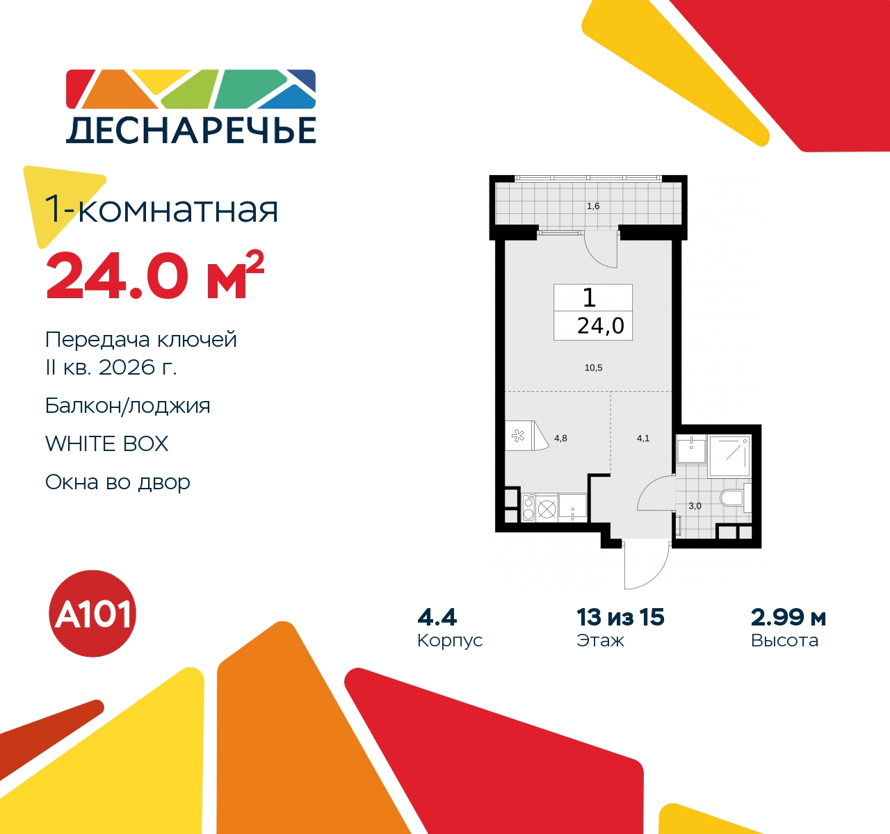 Продается 1-комн. квартира-студия с отделкой в ЖК "Деснаречье" на 13 этаже. Общая площадь: 24 кв.м., площадь гостиной 15.3 кв.м., из которых 4.8 кв.м. выделено под кухонную зону. Все окна выходят на одну сторону. В квартире один балкон, один совмещенный санузел. Высота потолков 2.99 м. Эта квартира будет сдана с дизайнеркой отделкой "под ключ". Специально для вас мы разработали несколько решений дизайнерской отделки. В отделке используются только современный высококлассные материалы, на все работы предоставляется гарантия. В таком случае вы оплачиваете отделку в сегодняшних ценах, а эту стоимость вы можете разнести в ипотечных платежах. Дом монолитный, черырехподъездный, высотой 15 этажей. Квартира находится во 2-й секции в корпусе 4.4. На этаже 6 квартир. В подъезде 1 пассажирский и 1 грузовой лифт. Начало строительства - 3 квартал 2023 года. Окончание строительства - 2 квартал 2026 года. Оформление сделки по договору долевого участия. Артикул квартиры по базе застройщика 88К-4.4-875. ПРЕДЛОЖЕНИЯ ОТ ЗАСТРОЙЩИКА В ОКТЯБРЕ 2025: Ипотека от 13,9 % для всех! На весь срок. "Семейная ипотека" вернулась. Ставка от 3,5 % на весь срок! Без удорожания! Выгодное ипотечное комбо: Ипотека от 2200 р./мес. и от 6 % после рождения ребёнка! Ипотека для всех "Держи пять!" - ставка 5 % на 2 года! *более подробную информацию по скидкам и акциям уточняйте в отделе продаж Масштабный проект "Деснаречье" на юго-западе Москвы, который включает три новых района («квартала»), объединённые общей идеей – воплотить в реальность мечты современных жителей столицы об интересном, комфортном и разноплановом городском пространстве в окружении рек и лесов, словно сошедших с полотен русских живописцев: - «Берег» оценят все, кому близка водная стихия: плеск волн, солнечные блики и прогулки вдоль тихого течения речи. - «Лес» утопает в зелени парков и лесов. Здесь соблюдён идеальный баланс загородного спокойствия и столичного комфорта. - «Парк», самый энергичный и яркий, отличается высокой концентрацией пространств для спорта и творчества. Жилой комплекс "Деснаречье" расположится в 12 км от МКАД по современному Калужскому шоссе. Внешний облик зданий соответствует современному стилю и стандартам, характерным и для других популярных проектов ГК «А101»: сочетание контрастных тонов, большое количество остекления, в котором отражается небо, гармония с природным окружением. Весь город - в вашем районе. Находиться на территории «15-минутного города» значит иметь всё необходимое для полноценной жизни в шаговой доступности. Маршруты в районе «Деснаречье» выстроены так, чтобы добраться до магазинов, парков, школ, салонов услуг и других объектов можно было всего за несколько минут пешком или на велосипеде. Двор закрытый от машин – это тишина, комфорт и безопасность, поэтому все машино-места (включая «семейные» и увеличенные, с возможностью установки роллетных шкафов) находятся в подземном паркинге. В паркинги можно спуститься на лифте из любого подъезда или по лестнице. Рядом с «Деснаречьем» в 2027 году планируется открытие станции метро «Десна», до которой будет удобно добраться пешком или на велосипеде. Дорога на автомобиле до перехватывающих парковок станций «Ольховая» и «Прокшино» займёт около 10 минут. В процессе реализации проекта будут появляться новые маршруты общественного транспорта по районам. Уже сейчас на Калу
