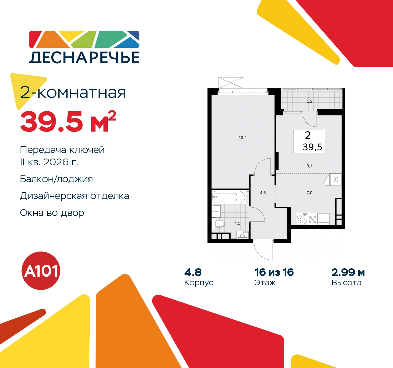 Продается двухкомнатная квартира с европланировкой и отделкой в ЖК "Деснаречье" на 16 этаже. Общая площадь: 39.5 кв.м., жилая: 22.5 кв.м., общая площадь гостиной-столовой с кухонной зоной: 16.1 кв.м. Европейская планировка, кухня и гостиная объединены в одно просторное помещение. Комнаты изолированные, все окна выходят на одну сторону. В квартире одна лоджия, один совмещенный санузел. Высота потолков 2.99 м. Эта квартира будет сдана с дизайнеркой отделкой "под ключ". Специально для вас мы разработали несколько решений дизайнерской отделки. В отделке используются только современный высококлассные материалы, на все работы предоставляется гарантия. В таком случае вы оплачиваете отделку в сегодняшних ценах, а эту стоимость вы можете разнести в ипотечных платежах. Дом монолитный, многоподъездный, переменной этажности, от 7 до 16 этажей. Квартира находится в 1-й секции высотой 16 этажей в корпусе 4.8. На этаже 6 квартир. В подъезде 1 пассажирский и 1 грузовой лифт. Начало строительства - 3 квартал 2023 года. Окончание строительства - 2 квартал 2026 года. Оформление сделки по договору долевого участия. Артикул квартиры по базе застройщика 88К-4.8-1784. ПРЕДЛОЖЕНИЯ ОТ ЗАСТРОЙЩИКА В ОКТЯБРЕ 2025: Ипотека от 13,9 % для всех! На весь срок. "Семейная ипотека" вернулась. Ставка от 3,5 % на весь срок! Без удорожания! Выгодное ипотечное комбо: Ипотека от 2200 р./мес. и от 6 % после рождения ребёнка! Ипотека для всех "Держи пять!" - ставка 5 % на 2 года! *более подробную информацию по скидкам и акциям уточняйте в отделе продаж Масштабный проект "Деснаречье" на юго-западе Москвы, который включает три новых района («квартала»), объединённые общей идеей – воплотить в реальность мечты современных жителей столицы об интересном, комфортном и разноплановом городском пространстве в окружении рек и лесов, словно сошедших с полотен русских живописцев: - «Берег» оценят все, кому близка водная стихия: плеск волн, солнечные блики и прогулки вдоль тихого течения речи. - «Лес» утопает в зелени парков и лесов. Здесь соблюдён идеальный баланс загородного спокойствия и столичного комфорта. - «Парк», самый энергичный и яркий, отличается высокой концентрацией пространств для спорта и творчества. Жилой комплекс "Деснаречье" расположится в 12 км от МКАД по современному Калужскому шоссе. Внешний облик зданий соответствует современному стилю и стандартам, характерным и для других популярных проектов ГК «А101»: сочетание контрастных тонов, большое количество остекления, в котором отражается небо, гармония с природным окружением. Весь город - в вашем районе. Находиться на территории «15-минутного города» значит иметь всё необходимое для полноценной жизни в шаговой доступности. Маршруты в районе «Деснаречье» выстроены так, чтобы добраться до магазинов, парков, школ, салонов услуг и других объектов можно было всего за несколько минут пешком или на велосипеде. Двор закрытый от машин – это тишина, комфорт и безопасность, поэтому все машино-места (включая «семейные» и увеличенные, с возможностью установки роллетных шкафов) находятся в подземном паркинге. В паркинги можно спуститься на лифте из любого подъезда или по лестнице. Рядом с «Деснаречьем» в 2027 году планируется открытие станции метро «Десна», до которой будет удобно добраться пешком или на велосипеде. Дорога на автомобиле до перехватывающих парковок станций «О