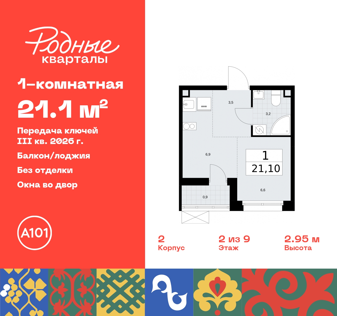 Однокомнатная квартира-студия в ЖК "Родные кварталы" на 2 этаже. Квартира без отделки, после выдачи ключей можно делать ремонт. Общая площадь: 21.1 кв.м., площадь гостиной 13.5 кв.м., из которых 6.9 кв.м. выделено под кухонную зону. Все окна выходят на одну сторону. В квартире одна лоджия, один совмещенный санузел. Высота потолков 2.9 м. Дом монолитный, многоподъездный, высотой 9 этажей. Квартира находится в 9-й секции в корпусе 2. На этаже 8 квартир. В подъезде 1 грузовой лифт. Начало строительства - 4 квартал 2023 года. Окончание строительства - 3 квартал 2026 года. Оформление сделки по договору долевого участия. Артикул квартиры по базе застройщика 96К-2-377. ПРЕДЛОЖЕНИЯ ОТ ЗАСТРОЙЩИКА В ОКТЯБРЕ 2025: Ипотека от 13,9 % для всех! На весь срок. "Семейная ипотека" вернулась. Ставка от 3,5 % на весь срок! Без удорожания! Выгодное ипотечное комбо: Ипотека от 2200 р./мес. и от 6 % после рождения ребёнка! Ипотека для всех "Держи пять!" - ставка 5 % на 2 года! *более подробную информацию по скидкам и акциям уточняйте в отделе продаж Новый жилой комплекс "Родные кварталы" строится в уютной, экологически благополучной локации на юго-западе столицы. В ближайшем окружении – ухоженные малоэтажные посёлки и живописный Ульяновский лесопарк. Благодаря этому из окон откроются вдохновляющие виды, которые не исчезнут со временем за фасадами многоэтажек. Через весь район пройдёт главный бульвар, который свяжет набережную, жилые кварталы и площади в единое дружелюбное пространство, органично наполненное узнаваемыми элементами культурных традиций разных народов. В жилом комплексе создаются условия для комфортного отдыха и занятий спортом всех жителей. Здесь можно прогуляться и отдохнуть в лесопарке на берегу ручья, позаниматься на тренажёрах под открытым небом и спортивных площадках. Для малышей построят игровые комплексы, развивающие силу, координацию и ловкость. Всего в жилом комплексе будет оборудовано 6 га территории для спокойного отдыха и около 9 га — для активного. Подъезды в домах освещены в любое время суток, входы и вестибюль хорошо просматриваются с улицы. Витражное остекление обеспечивает приток естественного света днём, а вечером зажигаются светильники. В отделке домов используется сочетание вентилируемого фасада с облицовкой из фибробетонной плитки и штукатуркой. Комфортная высота домов соразмерна человеку и в среднем составляет 10 этажей. Все дома обеспечены собственными подземными паркингами. В них размещаются машино-места и кладовые. В паркинг или кладовую можно спуститься на лифте или по лестнице. В комплексе появятся бытовые сервисы, магазины, аптеки и другие торгово-бытовые объекты. В жилом районе «Родные кварталы» будут построены: - образовательный центр: школа на 1300 учеников и детский сад на 250 малышей, - два детских сада на 200 мест каждый (один из них сдаётся в 1-й очереди). В транспортной доступности уже работают: - школа № 41 и детский сад — по Боровскому шоссе, - школа № 2057 и детский сад — на запад от района, в дер. Марушкино. ЖК «Родные кварталы» строится в Новомосковском округе столицы, в 15 минутах на автомобиле от аэропорта «Внуково». Район обеспечен удобными выездами на три крупные современные автотрассы. Здесь уже работает и активно развивается система наземного общественного транспорта, включая междугородние рейсы. Интенсивное развитие локации обеспечи