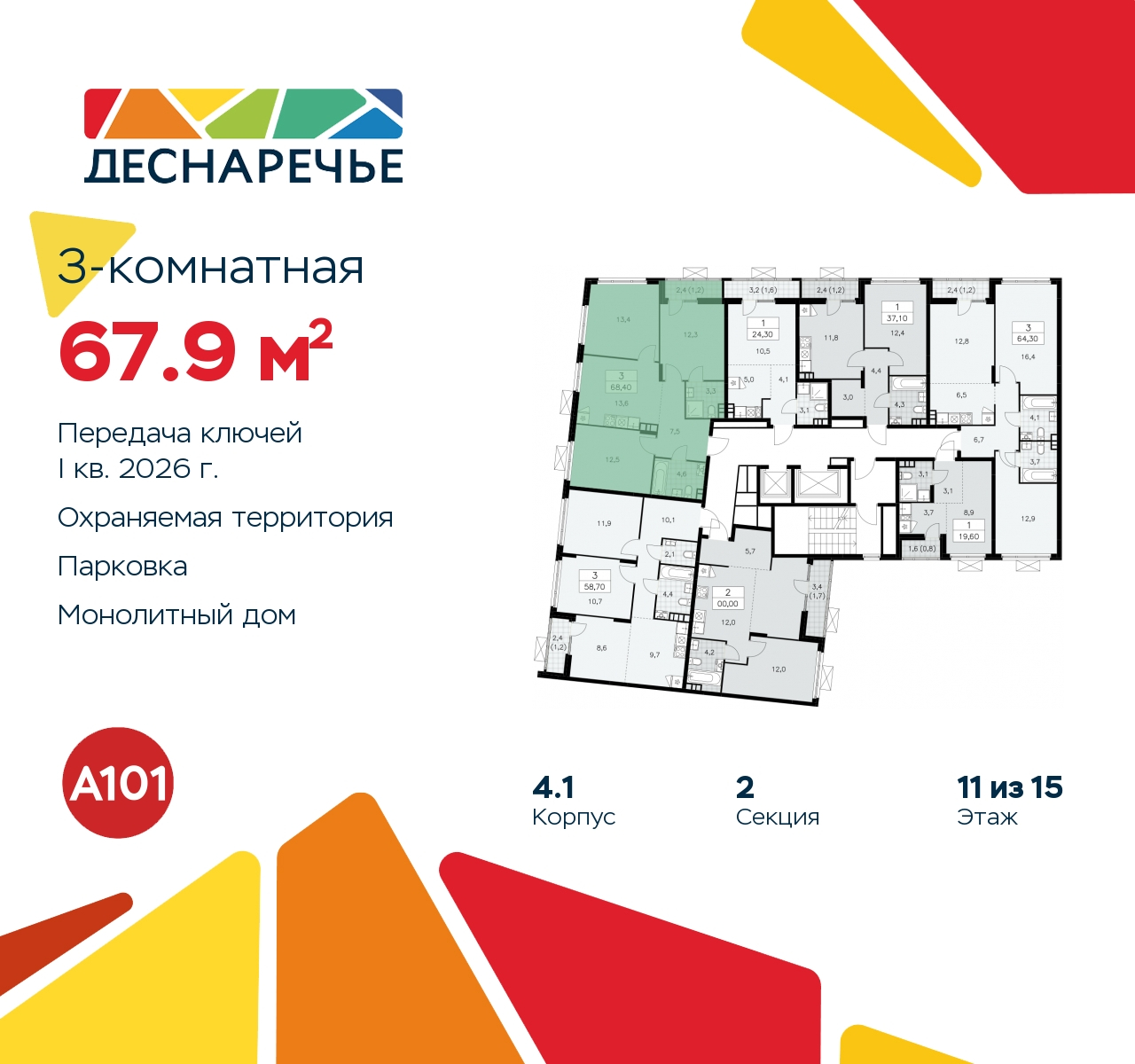 Трехкомнатная квартира от застройщика в ЖК "Деснаречье" на 11 этаже. Квартира без отделки, полностью готова к чистовой отделке и дальнейшему ремонту. Общая площадь: 67.9 кв.м., жилая: 38.2 кв.м., площадь просторной кухни-столовой: 13.4 кв.м. Квартира угловая, идеально подойдет любителям тишины и панорамных видов. В квартире одна лоджия, два совмещенных санузла. Высота потолков 2.99 м. Эта квартира предлагается без отделки. Будут установлены стеклопакеты с повышенной тепло- и шумоизоляцией, в квартиру заведены все коммуникации. Вы сможете в полном объеме реализовать ваши идеи обустройства вашего комфортного дома. Для тех, кто ценит время и не хочет дополнительных трат на ремонт мы предлагаем квартиры с предчистовой и дизайнерской отделкой. Дом монолитный, трехподъездный, высотой 15 этажей. Квартира находится во 2-й секции в корпусе 4.1. На этаже 7 квартир. В подъезде 1 пассажирский и 1 грузовой лифт. Начало строительства - 3 квартал 2023 года. Окончание строительства - 1 квартал 2026 года. Оформление сделки по договору долевого участия. Артикул квартиры по базе застройщика 88К-4.1-150. ПРЕДЛОЖЕНИЯ ОТ ЗАСТРОЙЩИКА В ОКТЯБРЕ 2025: Ипотека от 13,9 % для всех! На весь срок. "Семейная ипотека" вернулась. Ставка от 3,5 % на весь срок! Без удорожания! Выгодное ипотечное комбо: Ипотека от 2200 р./мес. и от 6 % после рождения ребёнка! Ипотека для всех "Держи пять!" - ставка 5 % на 2 года! *более подробную информацию по скидкам и акциям уточняйте в отделе продаж Масштабный проект "Деснаречье" на юго-западе Москвы, который включает три новых района («квартала»), объединённые общей идеей – воплотить в реальность мечты современных жителей столицы об интересном, комфортном и разноплановом городском пространстве в окружении рек и лесов, словно сошедших с полотен русских живописцев: - «Берег» оценят все, кому близка водная стихия: плеск волн, солнечные блики и прогулки вдоль тихого течения речи. - «Лес» утопает в зелени парков и лесов. Здесь соблюдён идеальный баланс загородного спокойствия и столичного комфорта. - «Парк», самый энергичный и яркий, отличается высокой концентрацией пространств для спорта и творчества. Жилой комплекс "Деснаречье" расположится в 12 км от МКАД по современному Калужскому шоссе. Внешний облик зданий соответствует современному стилю и стандартам, характерным и для других популярных проектов ГК «А101»: сочетание контрастных тонов, большое количество остекления, в котором отражается небо, гармония с природным окружением. Весь город - в вашем районе. Находиться на территории «15-минутного города» значит иметь всё необходимое для полноценной жизни в шаговой доступности. Маршруты в районе «Деснаречье» выстроены так, чтобы добраться до магазинов, парков, школ, салонов услуг и других объектов можно было всего за несколько минут пешком или на велосипеде. Двор закрытый от машин – это тишина, комфорт и безопасность, поэтому все машино-места (включая «семейные» и увеличенные, с возможностью установки роллетных шкафов) находятся в подземном паркинге. В паркинги можно спуститься на лифте из любого подъезда или по лестнице. Рядом с «Деснаречьем» в 2027 году планируется открытие станции метро «Десна», до которой будет удобно добраться пешком или на велосипеде. Дорога на автомобиле до перехватывающих парковок станций «Ольховая» и «Прокшино» займёт около 10 минут. В процессе реали