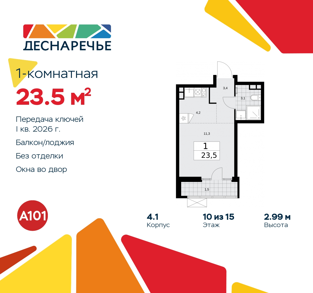 Продается 1-комн. квартира-студия в ЖК "Деснаречье" на 10 этаже. Квартира без отделки, после выдачи ключей можно делать ремонт. Общая площадь: 23.5 кв.м., площадь гостиной 15.5 кв.м., из которых 4.2 кв.м. выделено под кухонную зону. Все окна выходят на одну сторону. В квартире один балкон, один совмещенный санузел. Высота потолков 2.99 м. Эта квартира предлагается без отделки. Будут установлены стеклопакеты с повышенной тепло- и шумоизоляцией, в квартиру заведены все коммуникации. Вы сможете в полном объеме реализовать ваши идеи обустройства вашего комфортного дома. Для тех, кто ценит время и не хочет дополнительных трат на ремонт мы предлагаем квартиры с предчистовой и дизайнерской отделкой. Дом монолитный, трехподъездный, высотой 15 этажей. Квартира находится в 3-й секции в корпусе 4.1. На этаже 6 квартир. В подъезде 1 пассажирский и 1 грузовой лифт. Начало строительства - 3 квартал 2023 года. Окончание строительства - 1 квартал 2026 года. Оформление сделки по договору долевого участия. Артикул квартиры по базе застройщика 88К-4.1-234. ПРЕДЛОЖЕНИЯ ОТ ЗАСТРОЙЩИКА В ОКТЯБРЕ 2025: Ипотека от 13,9 % для всех! На весь срок. "Семейная ипотека" вернулась. Ставка от 3,5 % на весь срок! Без удорожания! Выгодное ипотечное комбо: Ипотека от 2200 р./мес. и от 6 % после рождения ребёнка! Ипотека для всех "Держи пять!" - ставка 5 % на 2 года! *более подробную информацию по скидкам и акциям уточняйте в отделе продаж Масштабный проект "Деснаречье" на юго-западе Москвы, который включает три новых района («квартала»), объединённые общей идеей – воплотить в реальность мечты современных жителей столицы об интересном, комфортном и разноплановом городском пространстве в окружении рек и лесов, словно сошедших с полотен русских живописцев: - «Берег» оценят все, кому близка водная стихия: плеск волн, солнечные блики и прогулки вдоль тихого течения речи. - «Лес» утопает в зелени парков и лесов. Здесь соблюдён идеальный баланс загородного спокойствия и столичного комфорта. - «Парк», самый энергичный и яркий, отличается высокой концентрацией пространств для спорта и творчества. Жилой комплекс "Деснаречье" расположится в 12 км от МКАД по современному Калужскому шоссе. Внешний облик зданий соответствует современному стилю и стандартам, характерным и для других популярных проектов ГК «А101»: сочетание контрастных тонов, большое количество остекления, в котором отражается небо, гармония с природным окружением. Весь город - в вашем районе. Находиться на территории «15-минутного города» значит иметь всё необходимое для полноценной жизни в шаговой доступности. Маршруты в районе «Деснаречье» выстроены так, чтобы добраться до магазинов, парков, школ, салонов услуг и других объектов можно было всего за несколько минут пешком или на велосипеде. Двор закрытый от машин – это тишина, комфорт и безопасность, поэтому все машино-места (включая «семейные» и увеличенные, с возможностью установки роллетных шкафов) находятся в подземном паркинге. В паркинги можно спуститься на лифте из любого подъезда или по лестнице. Рядом с «Деснаречьем» в 2027 году планируется открытие станции метро «Десна», до которой будет удобно добраться пешком или на велосипеде. Дорога на автомобиле до перехватывающих парковок станций «Ольховая» и «Прокшино» займёт около 10 минут. В процессе реализации проекта будут появляться новые маршруты обще