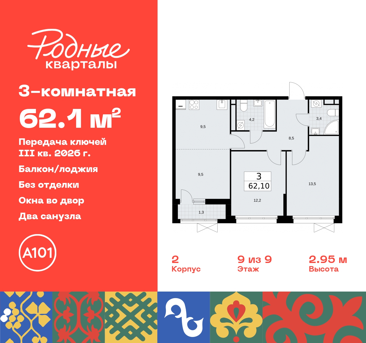 Продается трехкомнатная квартира с европланировкой в ЖК "Родные кварталы" на 9 этаже. Квартира без отделки, новый собственник может сделать ремонт по своему дизайн-проекту. Общая площадь: 62.1 кв.м., жилая: 35.2 кв.м., общая площадь гостиной-столовой с кухонной зоной: 19 кв.м. Европейская планировка, кухня и гостиная объединены в одно просторное помещение. Комнаты изолированные, все окна выходят на одну сторону. В квартире одна лоджия, два совмещенных санузла. Высота потолков 2.9 м. Дом монолитный, многоподъездный, высотой 9 этажей. Квартира находится в 8-й секции в корпусе 2. На этаже 5 квартир. В подъезде 1 грузовой лифт. Начало строительства - 4 квартал 2023 года. Окончание строительства - 3 квартал 2026 года. Оформление сделки по договору долевого участия. Артикул квартиры по базе застройщика 96К-2-375. ПРЕДЛОЖЕНИЯ ОТ ЗАСТРОЙЩИКА В ОКТЯБРЕ 2025: Ипотека от 13,9 % для всех! На весь срок. "Семейная ипотека" вернулась. Ставка от 3,5 % на весь срок! Без удорожания! Выгодное ипотечное комбо: Ипотека от 2200 р./мес. и от 6 % после рождения ребёнка! Ипотека для всех "Держи пять!" - ставка 5 % на 2 года! *более подробную информацию по скидкам и акциям уточняйте в отделе продаж Новый жилой комплекс "Родные кварталы" строится в уютной, экологически благополучной локации на юго-западе столицы. В ближайшем окружении – ухоженные малоэтажные посёлки и живописный Ульяновский лесопарк. Благодаря этому из окон откроются вдохновляющие виды, которые не исчезнут со временем за фасадами многоэтажек. Через весь район пройдёт главный бульвар, который свяжет набережную, жилые кварталы и площади в единое дружелюбное пространство, органично наполненное узнаваемыми элементами культурных традиций разных народов. В жилом комплексе создаются условия для комфортного отдыха и занятий спортом всех жителей. Здесь можно прогуляться и отдохнуть в лесопарке на берегу ручья, позаниматься на тренажёрах под открытым небом и спортивных площадках. Для малышей построят игровые комплексы, развивающие силу, координацию и ловкость. Всего в жилом комплексе будет оборудовано 6 га территории для спокойного отдыха и около 9 га — для активного. Подъезды в домах освещены в любое время суток, входы и вестибюль хорошо просматриваются с улицы. Витражное остекление обеспечивает приток естественного света днём, а вечером зажигаются светильники. В отделке домов используется сочетание вентилируемого фасада с облицовкой из фибробетонной плитки и штукатуркой. Комфортная высота домов соразмерна человеку и в среднем составляет 10 этажей. Все дома обеспечены собственными подземными паркингами. В них размещаются машино-места и кладовые. В паркинг или кладовую можно спуститься на лифте или по лестнице. В комплексе появятся бытовые сервисы, магазины, аптеки и другие торгово-бытовые объекты. В жилом районе «Родные кварталы» будут построены: - образовательный центр: школа на 1300 учеников и детский сад на 250 малышей, - два детских сада на 200 мест каждый (один из них сдаётся в 1-й очереди). В транспортной доступности уже работают: - школа № 41 и детский сад — по Боровскому шоссе, - школа № 2057 и детский сад — на запад от района, в дер. Марушкино. ЖК «Родные кварталы» строится в Новомосковском округе столицы, в 15 минутах на автомобиле от аэропорта «Внуково». Район обеспечен удобными выездами на три крупные современные автотрассы. Здес