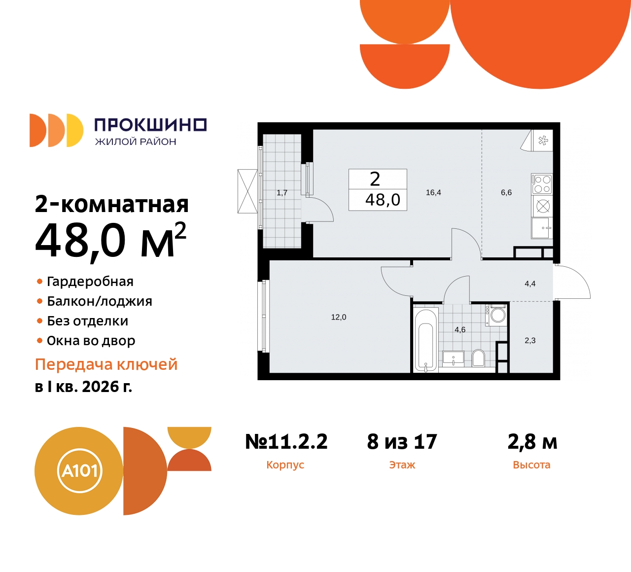 2-комн. квартира с европланировкой в ЖК "Прокшино" на 8 этаже. Квартира без отделки, после оформления собственности можно делать ремонт. Общая площадь: 48 кв.м., жилая: 28.4 кв.м., общая площадь гостиной-столовой с кухонной зоной: 23 кв.м. Европейская планировка, кухня-гостиная - идеальный вариант для тех, кто любит часто принимать гостей. Комнаты изолированные, все окна выходят на одну сторону. В квартире одна лоджия, один совмещенный санузел. Высота потолков 2.8 м. Эта квартира предлагается без отделки. Будут установлены стеклопакеты с повышенной тепло- и шумоизоляцией, в квартиру заведены все коммуникации. Вы сможете в полном объеме реализовать ваши идеи обустройства вашего комфортного дома. Имеется ниша под гардероб. Квартира находится в корпусе 11.2.2. Дом монолитный, одноподъездный, высотой 17 этажей. На этаже 9 квартир. В подъезде 1 пассажирский и 1 грузовой лифт. Начало строительства - 3 квартал 2023 года. Окончание строительства - 1 квартал 2026 года. Оформление сделки по договору долевого участия. Артикул квартиры по базе застройщика 58К-11.2.2-337. В шаговой доступности от жилого комплекса имеются станции метро (расстояние по прямой): «Филатов луг» (1.4 км), «Прокшино» (1.7 км), также недалеко от этого корпуса находятся станции метро: «Саларьево», «Румянцево», «Теплый стан». ПРЕДЛОЖЕНИЯ ОТ ЗАСТРОЙЩИКА В ОКТЯБРЕ 2025: Ипотека от 13,9 % для всех! На весь срок. "Семейная ипотека" вернулась. Ставка от 3,5 % на весь срок! Без удорожания! Выгодное ипотечное комбо: Ипотека от 2200 р./мес. и от 6 % после рождения ребёнка! Ипотека для всех "Держи пять!" - ставка 5 % на 2 года! *более подробную информацию по скидкам и акциям уточняйте в отделе продаж ЖК «Прокшино» расположен в 7,6 км от МКАД в Новой Москве. В 8 минутах пешком находится станция метро "Прокшино" быстрой и комфортной красной линии метро. Высокую транспортную доступность обеспечивают и два крупных шоссе, до которых легко доехать за 5 минут по новой скоростной автотрассе Солнцево – Бутово – Варшавское шоссе. Жилой комплекс "Прокшино" входит в кластер Прокшино. В районе появятся дома комфорт и бизнес-класса с подземным паркингом, закрытыми благоустроенными дворами без машин, местами для активного и созерцательного отдыха, магазинами, бытовыми сервисами и другими коммерческими объектами. Рядом пруд с собственной набережной и городской парк «Хованская дубрава». Для маленьких жителей построят детские сады, образовательный комплекс. (AQID02270102)