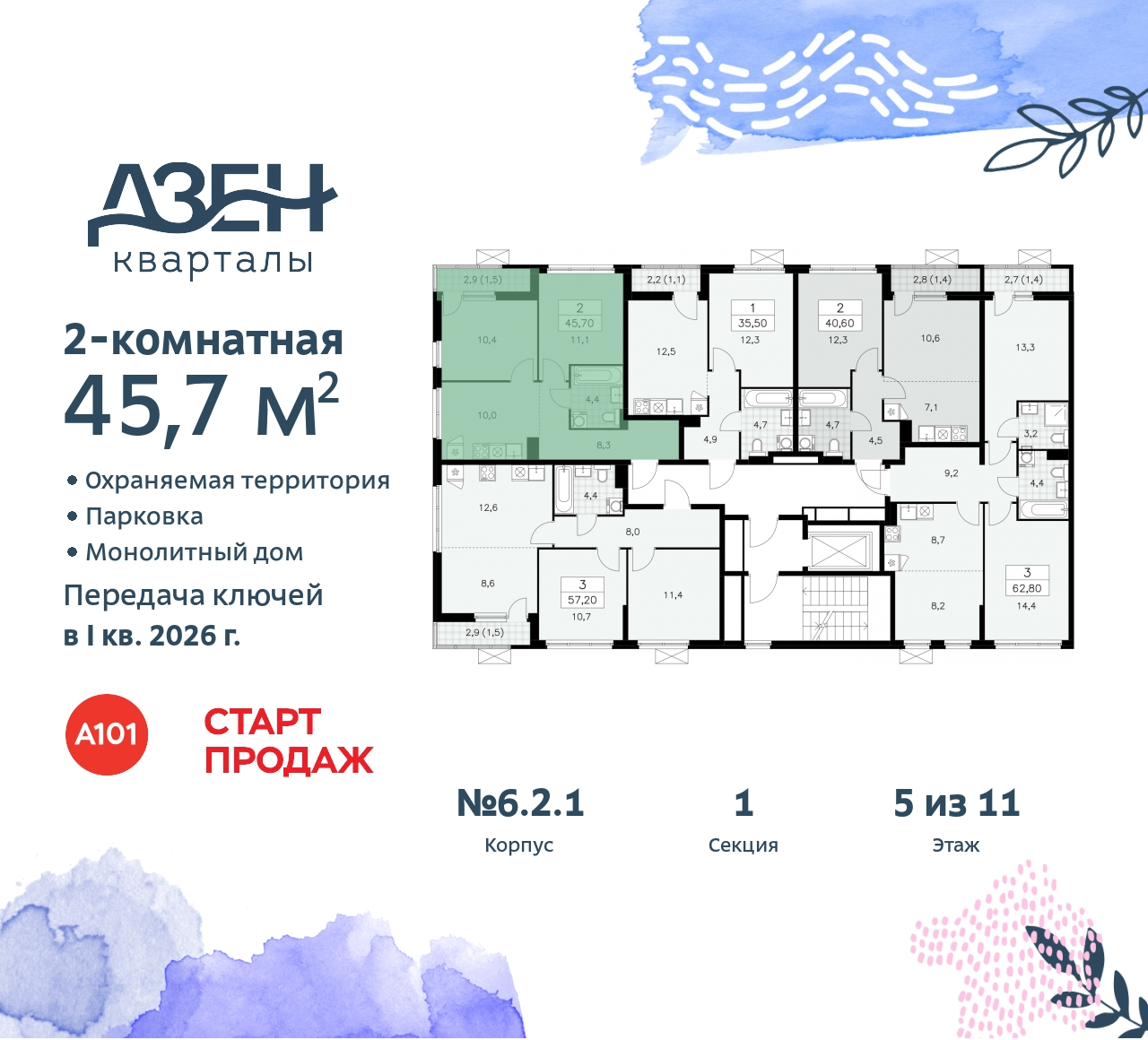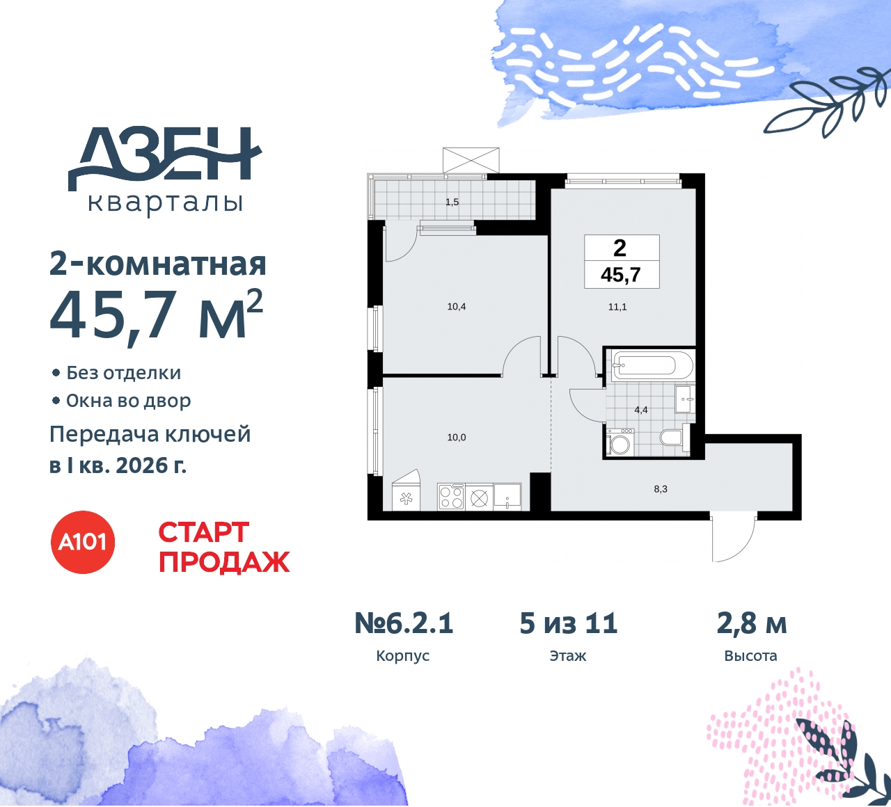 Продается двухкомнатная квартира в ЖК "Дзен-кварталы" на 5 этаже. Квартира без отделки, после выдачи ключей можно делать ремонт. Общая площадь: 45.7 кв.м., жилая: 21.5 кв.м., площадь просторной кухни-столовой: 10 кв.м. Квартира угловая, окна oбecпeчивaют paвнoмepнoe ocвeщeниe в тeчeниe дня. В квартире одна лоджия, один совмещенный санузел. Высота потолков 2.8 м. Эта квартира предлагается без отделки. Будут установлены стеклопакеты с повышенной тепло- и шумоизоляцией, в квартиру заведены все коммуникации. Вы сможете в полном объеме реализовать ваши идеи обустройства вашего комфортного дома. Дом монолитный, многоподъездный, переменной этажности, от 8 до 11 этажей. Квартира находится в 1-й секции высотой 8 этажей в корпусе 6.2.1. На этаже 5 квартир. В подъезде 1 грузовой лифт. Начало строительства - 4 квартал 2023 года. Окончание строительства - 1 квартал 2026 года. Оформление сделки по договору долевого участия. Артикул квартиры по базе застройщика 41К-6.2.1-17. В шаговой доступности от жилого комплекса расположены станции метро (расстояние по прямой): «Новомосковская (Коммунарка)» (800 м), «Новомосковская» (800 м), «Потапово» (900 м), также недалеко от этого корпуса находятся станции метро: «Коммунарка», «Улица Горчакова», «Бульвар адмирала Ушакова», «Ольховая», «Бунинская аллея». ПРЕДЛОЖЕНИЯ ОТ ЗАСТРОЙЩИКА В ОКТЯБРЕ 2025: Ипотека от 13,9 % для всех! На весь срок. "Семейная ипотека" вернулась. Ставка от 3,5 % на весь срок! Без удорожания! Выгодное ипотечное комбо: Ипотека от 2200 р./мес. и от 6 % после рождения ребёнка! Ипотека для всех "Держи пять!" - ставка 5 % на 2 года! *более подробную информацию по скидкам и акциям уточняйте в отделе продаж Новый район «Дзен-кварталы» возводится на юго-западе столицы – вдоль береговой линии живописного Ивановского пруда и реки Варварки. В основе проекта – «сочетание несочетаемого», гармония простого и утончённого, природного и урбанистического – стиль Japandi, объединяющий скандинавскую функциональность и восточную созерцательность. В приятном соседстве с домами нового района живописный Ивановский пруд — его береговая линия проходит по территории «Дзен-кварталов». Здесь будет благоустроена набережная для отдыха жителей нового района — по авторскому проекту Группы компаний «А101». На территории района появятся два детских сада и крупный образовательный комплекс, в состав которого войдут детский сад и школа. Все они будут спроектированы на основе собственной концепции образовательной среды ГК «А101», разработанной экспертами в области педагогики, детский психологии и эргономики учебных пространств. Фасадные решения выполнены в современном архитектурном стиле, основанном на сочетании японского минимализма и скандинавской функциональности. Использованы природные оттенки спокойного японского пейзажа, материалы, имитирующие натуральные поверхности – штукатурка, облицовочная плитка разных размеров и текстур. Подобный стилистический подход делает пространство созерцательными и гармоничным. Для комфортного хранения габаритных и сезонных вещей на уровне подземного этажа спланированы удобные кладовые помещения. Доступ в них осуществляется на лифте. Отличная транспортная доступность. 2 станции метро, "Коммунарка" и "Потапово" в минутной шаговой доступности. Обстановки общественного транспорт, транспортные развязки и удобный выезд на трассу Со