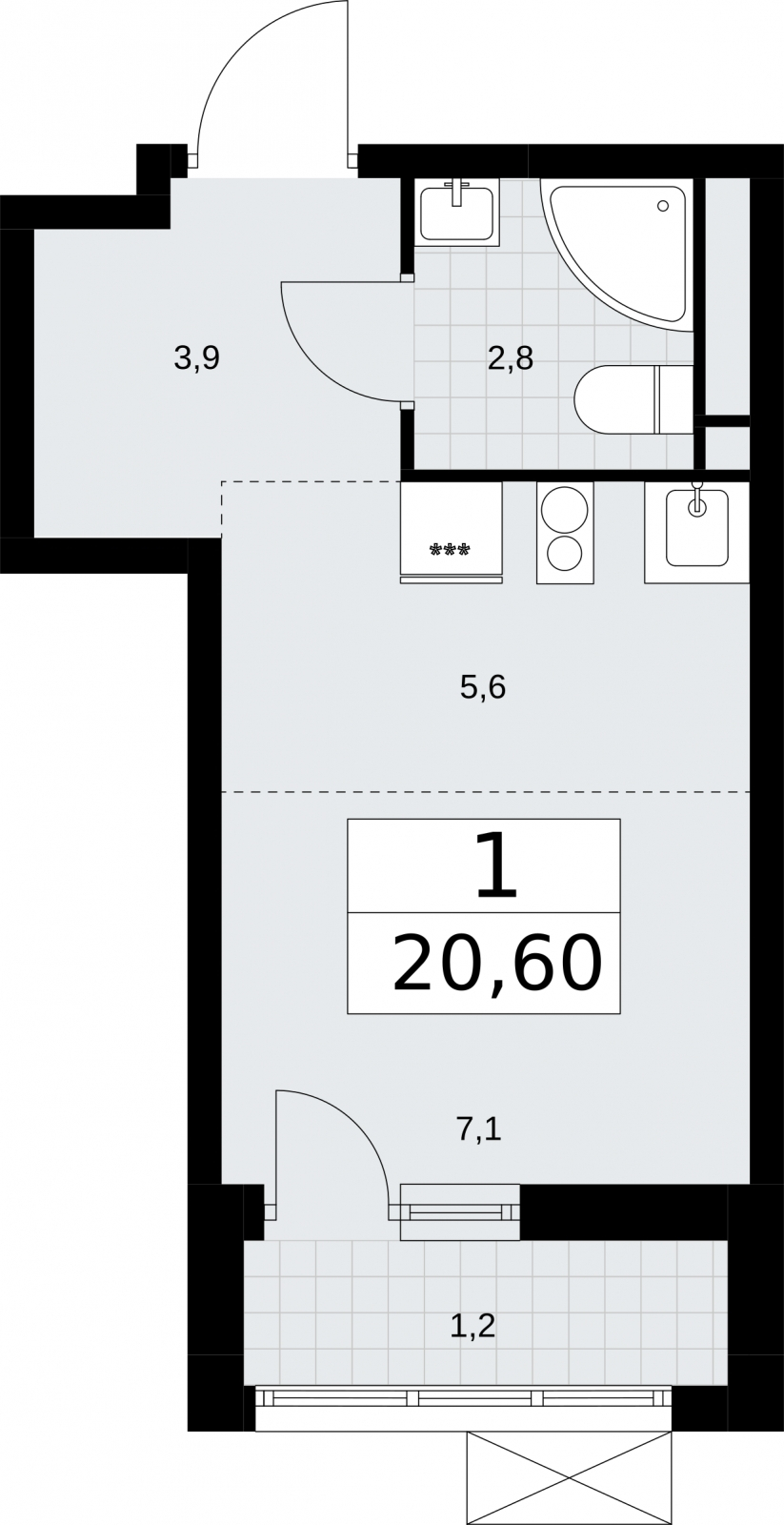 - Общая площадь 20.6 м²